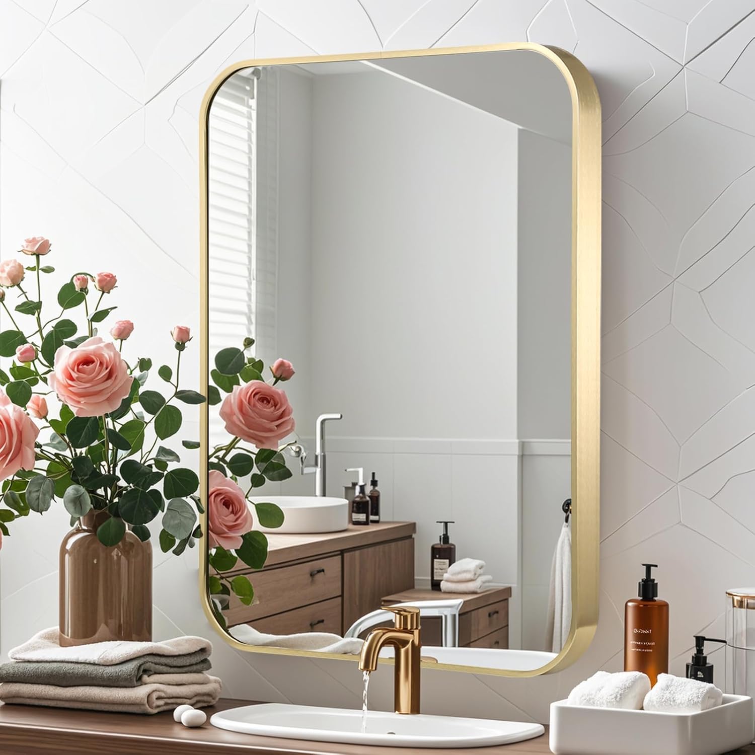 Gold Bathroom Mirror, 20x28 Inch Brushed Gold Mirror, Aluminum Alloy Framed Vanity Mirror, Rounded Rectangle Mirror for Over Sink, Anti-Rust Wall Mirror (Horizontally or Vertically)