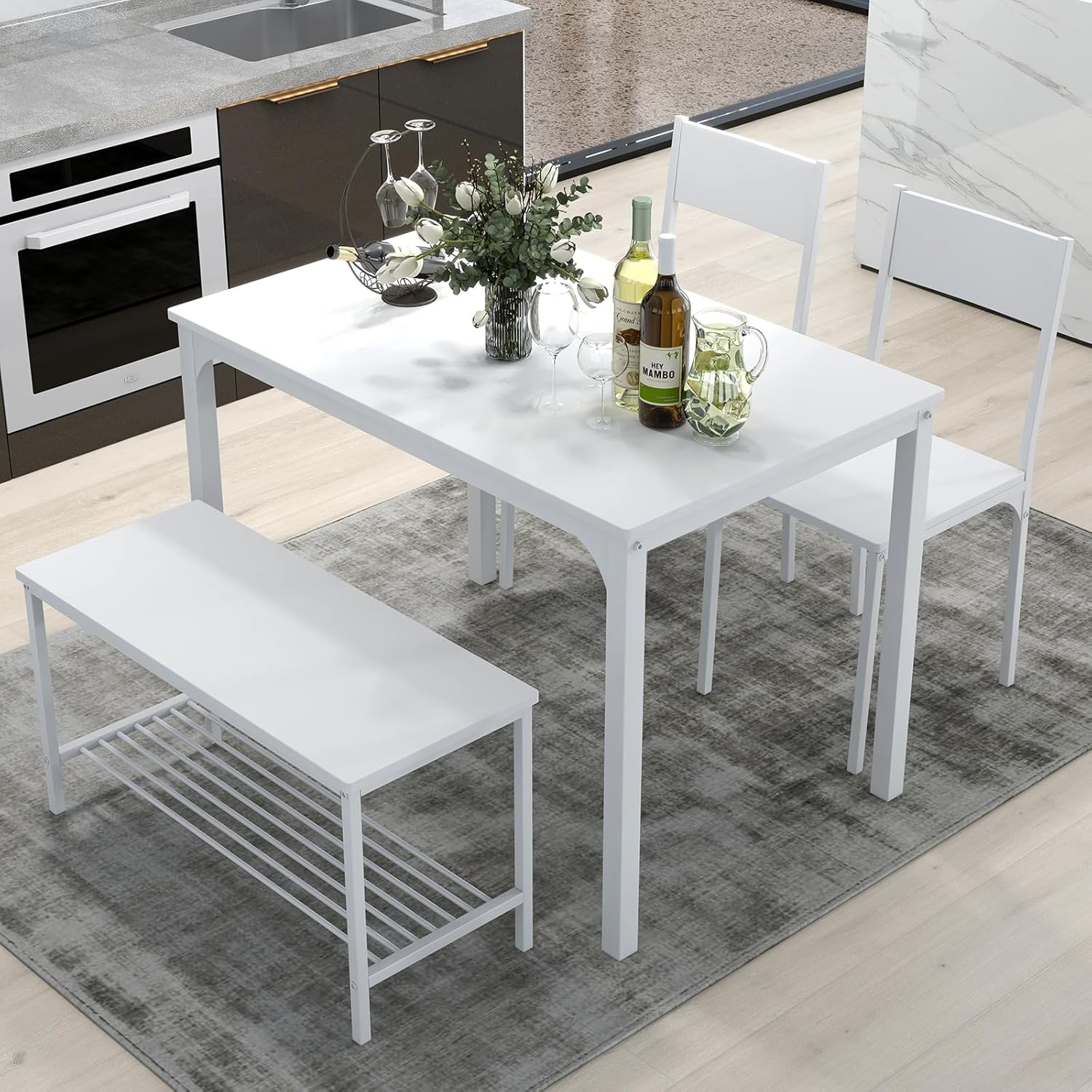 - Smart Space-Saving: With two chairs and a long bench, our dining set conveniently tucks under the table when not in use, maximizing space efficiency. The under-bench storage shelf keeps your home organized and clutter-free.