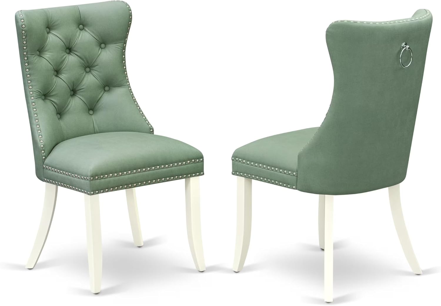 - DINING ROOM SET FINISH: The contemporary dining table collection radiates an atmosphere of elegance, highlighted by its polished linen white coating. The dining chairs, adorned in tasteful Willow Green Polyester Fabric, gracefully complement the dining table, adding a contemporary element to the arrangement.