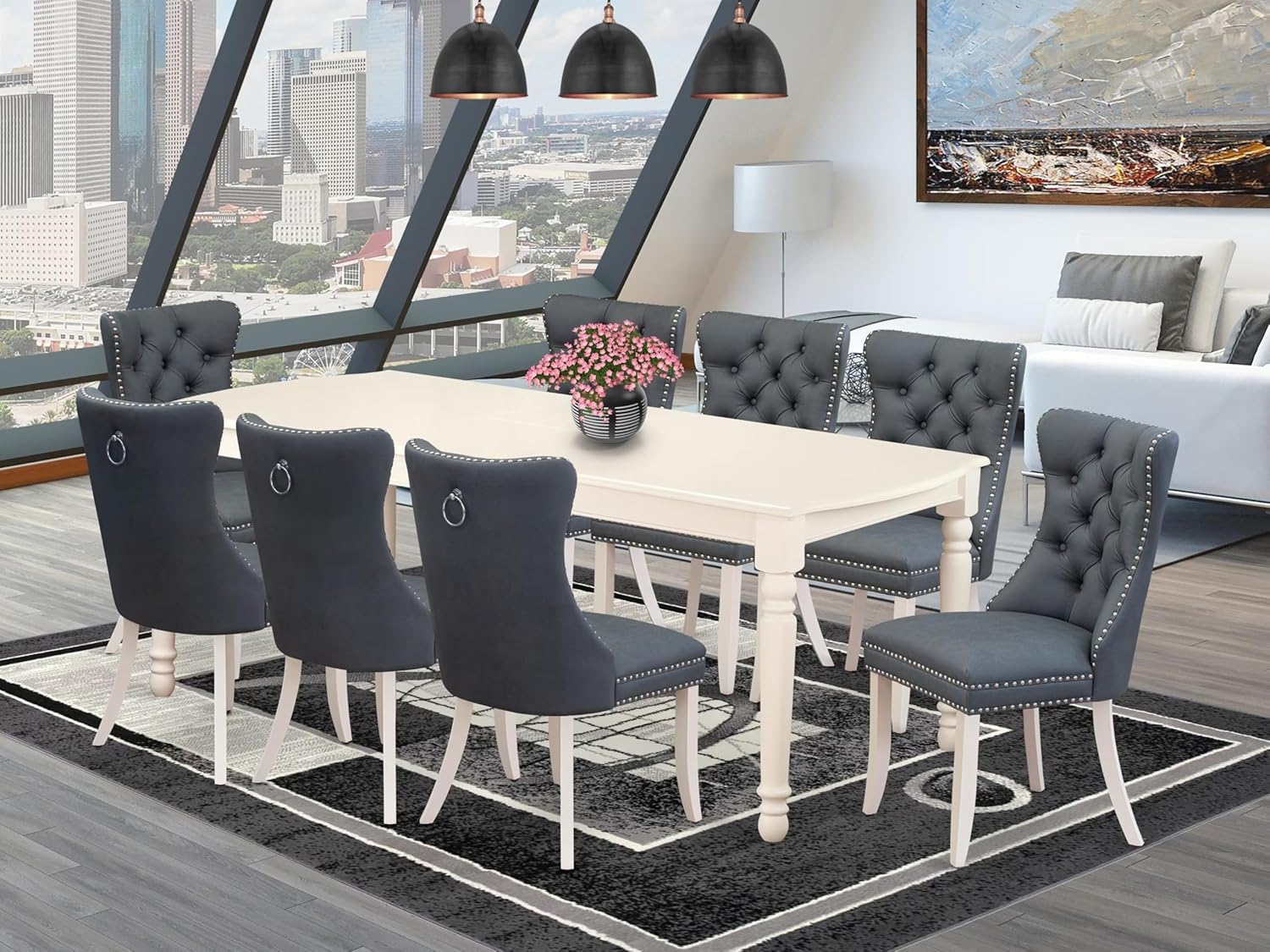- DINING ROOM SET FINISH: The dining table arrangement radiates an atmosphere of elegance, highlighted by its polished linen white coating. The dining chairs, expertly adorned in chic Platinum Gray synthetic Polyester Fabric, beautifully complement the table, adding a contemporary flair to the collection. The timeless allure of the modern dining table set contributes to the enhancement of the kitchen space, crafting a warm and enthralling atmosphere that is guaranteed to make an enduring impact.