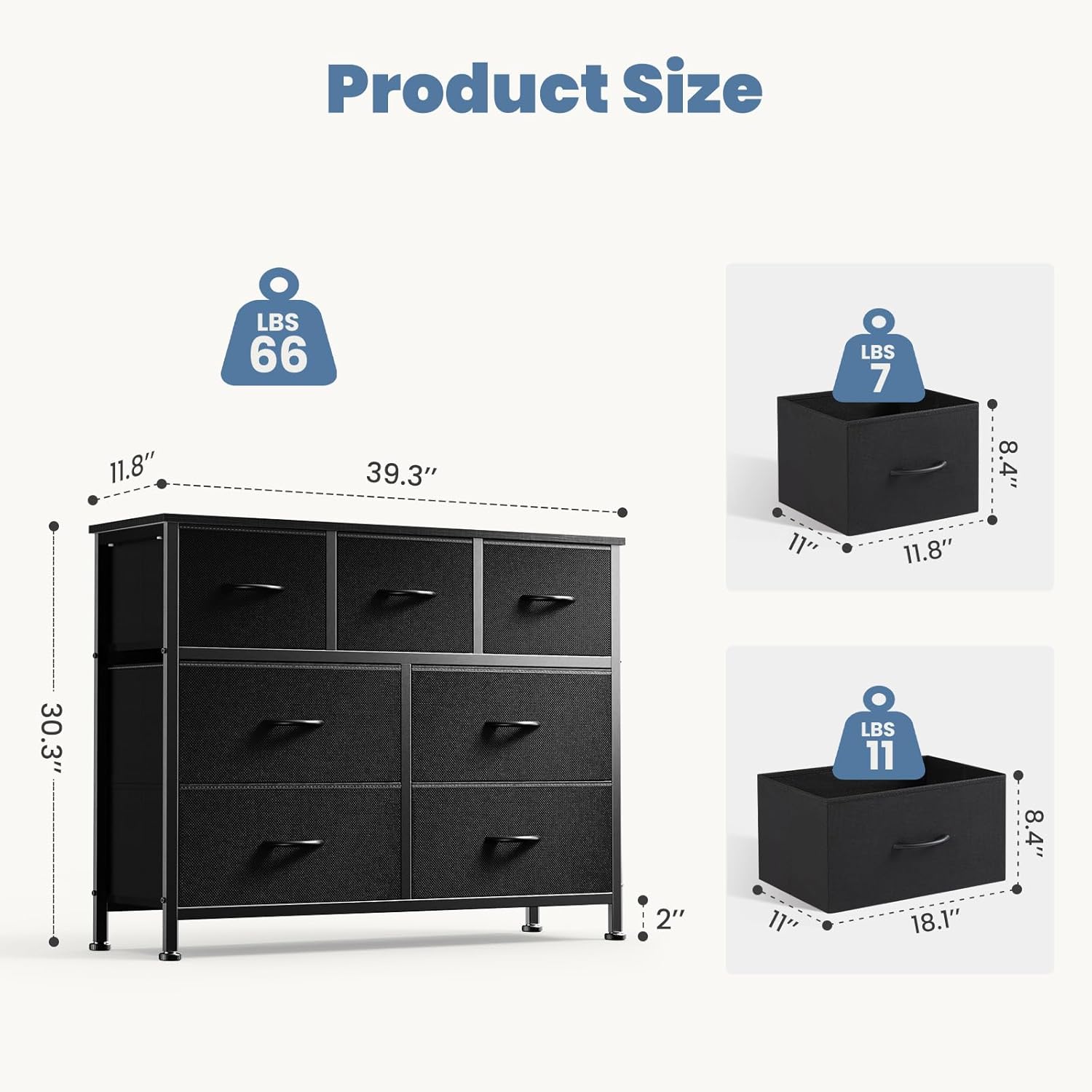 - 【Attention to the FULL-size】This bedroom dresser features fabric bins, providing space-saving storage for magazines, adult or Guest's clothing, books, and more. The wooden top board can support up to 66 pounds and can even serve as a TV stand. Please confirm the dimensions of this 7-drawer dresser: 39"D x 11.8"W x 30"H.