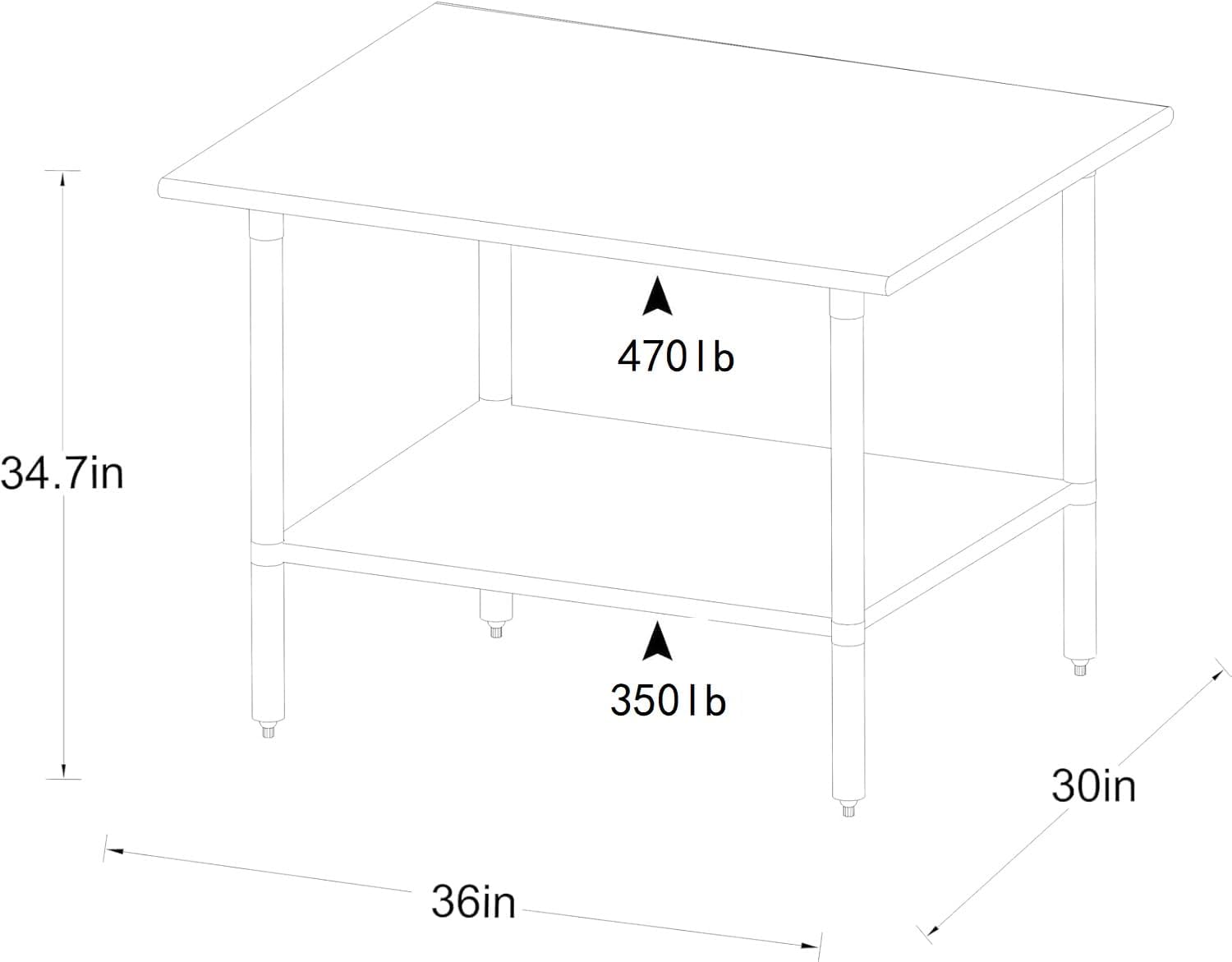 - Durable 2 Layer Design -This heavy duty table desktop load capacity is 470 lbs, and the undershelf can carry 350 lbs. Its strong load - bearing capacity can easily carry microwave oven, kitchen utensils or any other tools.Dimension 30 by 36 by 34.7 inches (DxWxH), offer you enough storage room