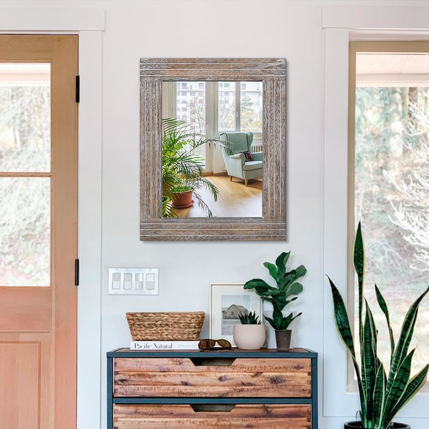 - Style and elegance: The superior natural solid wood frame with rustic colour has a subtle vintage feel. This farmhouse style wall mirror will bring a rustic feel to your space