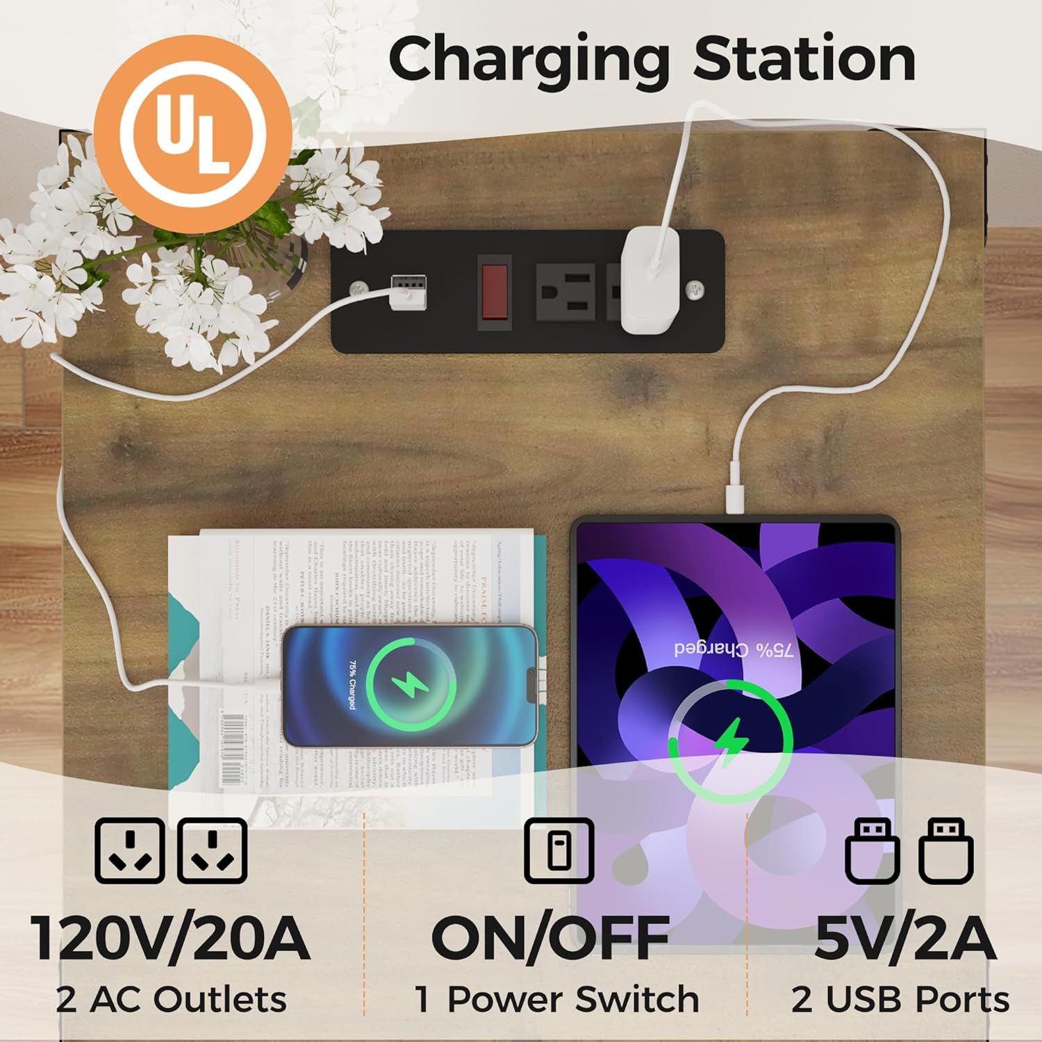 - 【UL Certified Charging Station with Control Switch】The tall nightstand features a convenient control switch for easy power management. With 2 USB ports and 2 plug sockets, you can power up your smartphone, tablet, and other gadgets right by your side.