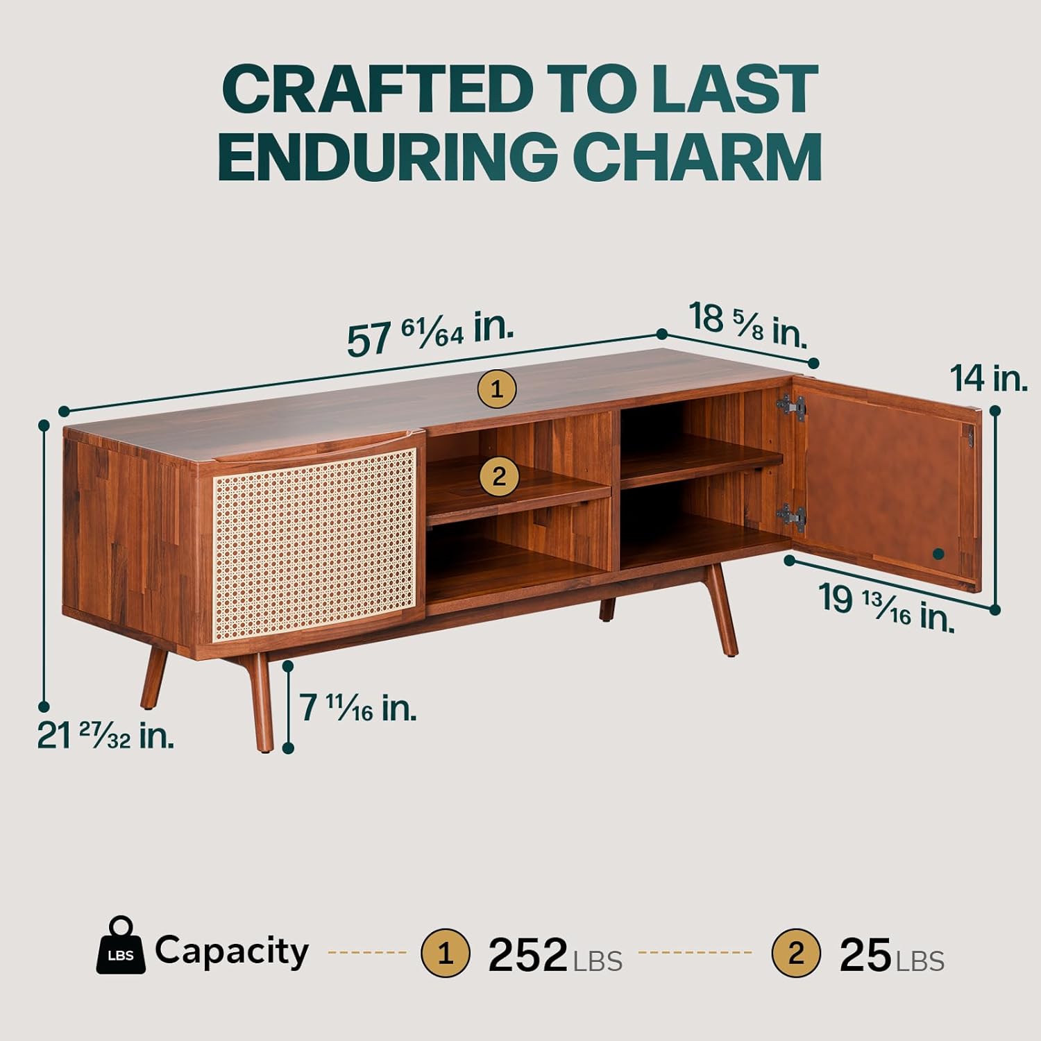 Bme TV Stand with Elegant Curved Shape & Inlaid Rattan, Nancy Solid Wood Tv Stand, Craft to Last Entertainment Center with Smiley Handle & Adjustable Shelf, Mid Century Modern TV Media Console