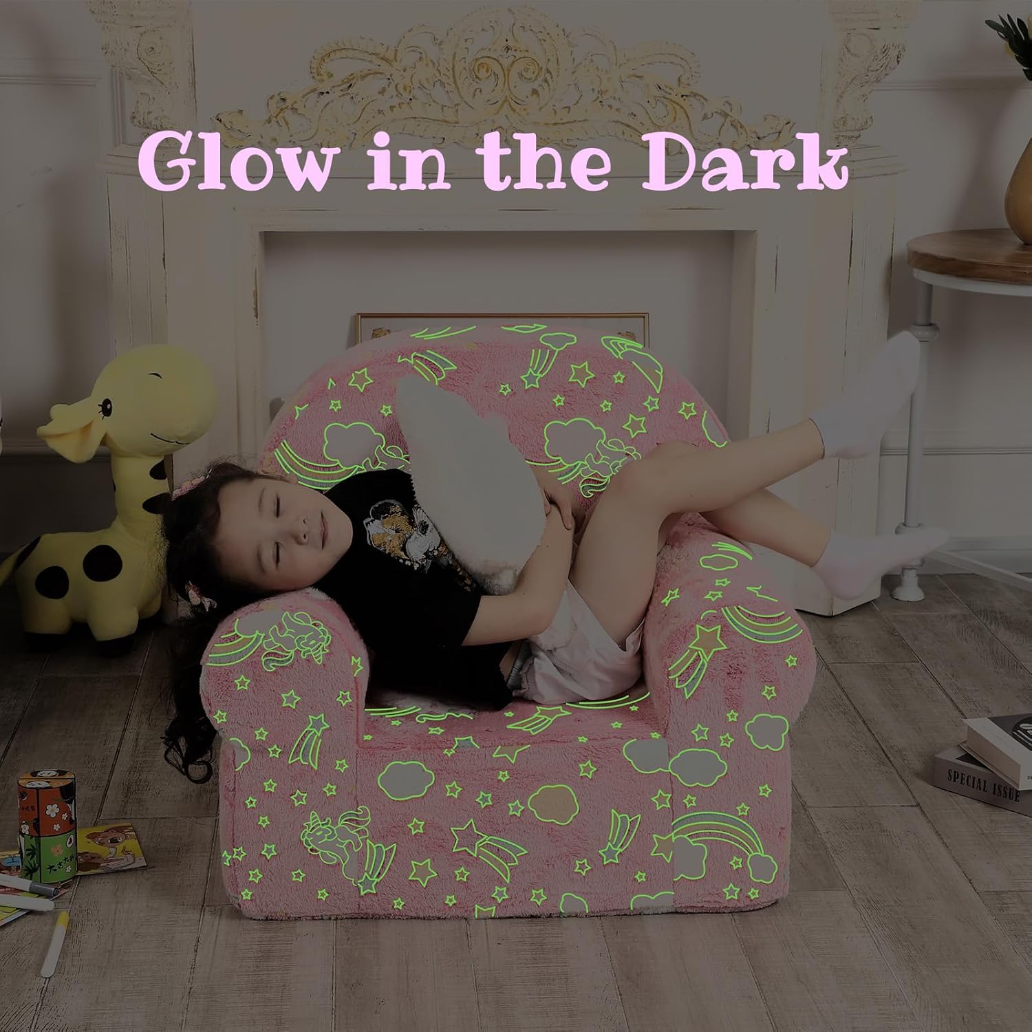 - Glow in the Dark: The kids sofa chair is made of glowing plush polyester and is filled with premium foam to support kid's body. The toddler chair strewn with glow-in-the-dark unicorns adds a fun element to any room.