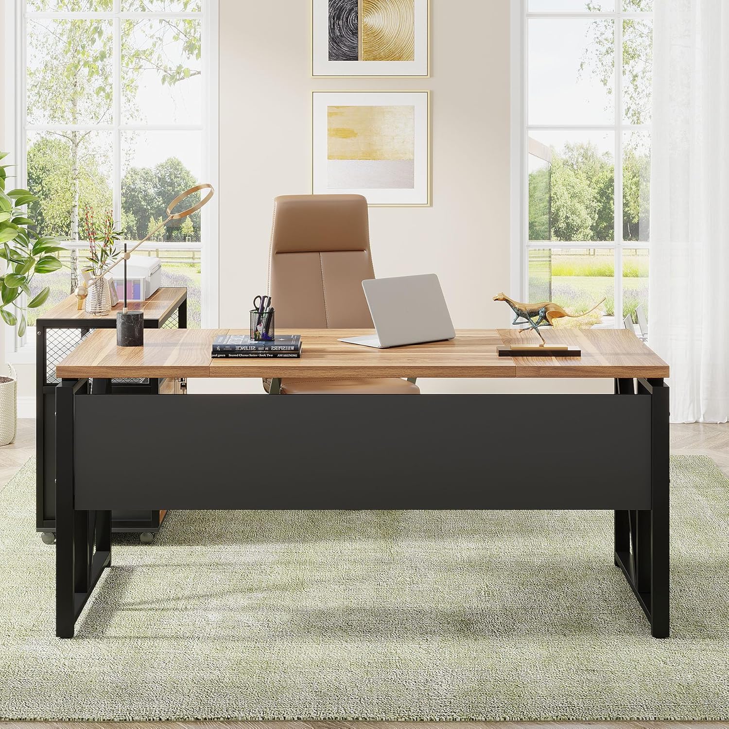 - 【Sturdy & Beautiful finish】:The office desk constructed of heavy-duty metal frame and thickened compressed board (1.2 inch) ensure durability and stability. The furniture set is a combination of vintage colors and black match any decor style.