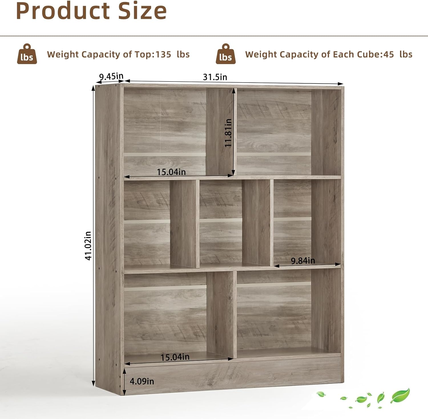 - 【Sturdy Structure & Elevated Base】The design of the bedroom bookshelf makes its structure more stable and less prone to deformation, which allows it to accompany you for years. The elevated 4.13in" base can keep your books away from dust and dampness, which also makes it easier for cleaning.Each open cube of the brown bookshelf can hold up to 45 pounds. Size:31.5''L x 9.45''W x 41.02''H.