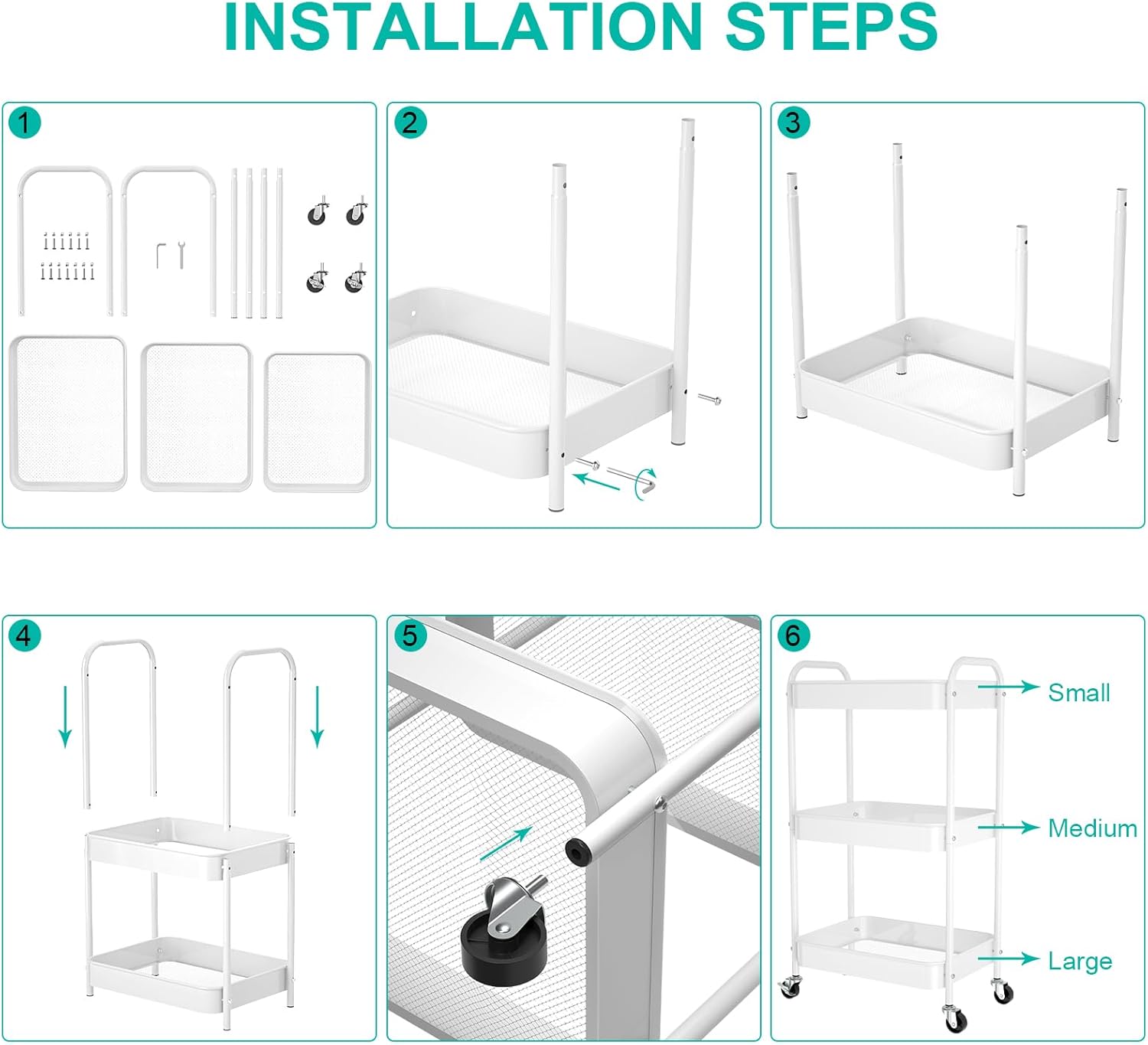 3-Tier Rolling Metal Storage Cart with Wheels, Multi-Functional Organizer for Office, Kitchen, Bathroom, Books Diapers - Easy Assembly (White)