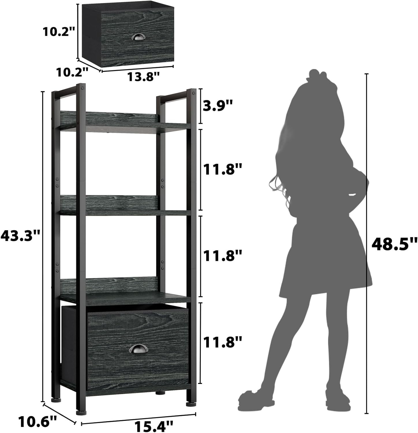 - [Easy to Assemble]: Bookshelf overall dimension is 15.4"L x 10.6" D x 43.3"H. Easy to follow instructions including, the hardware and tools included and each accessory is labeled for easy installation. We provides customer service before and after purchase. If you have any questions, please feel free to contact us.