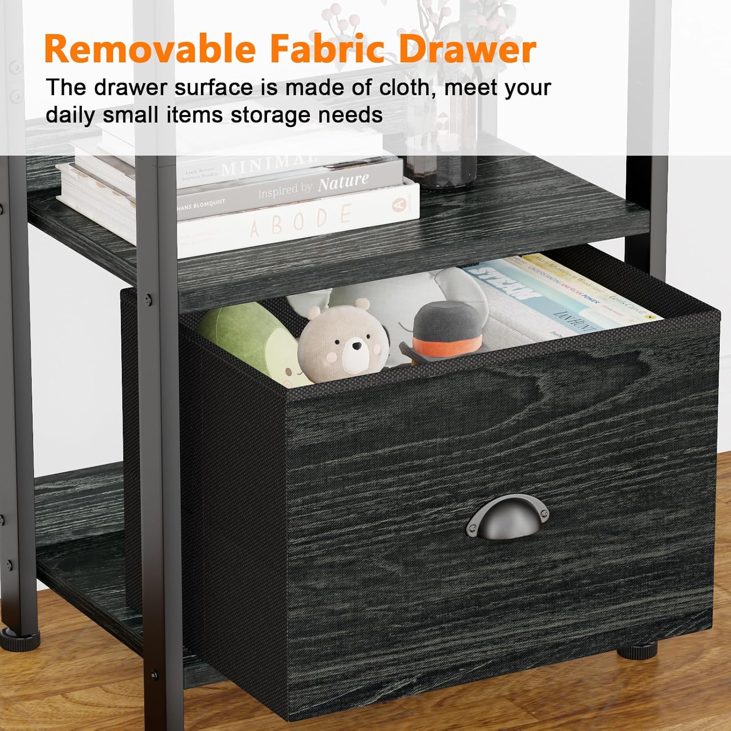 - [Bookshelves with Removable Fabric Drawer]: This skinny short bookcase with a drawer, and the surface is made of cloth, which is light and soft. This design adds security, so it is suitable for use in the nursery or kids room. Drawer size is 13.7"W x 10.2" D x 10.2"H, same as a small storage box, can be placed anywhere, closet for storage as you like!