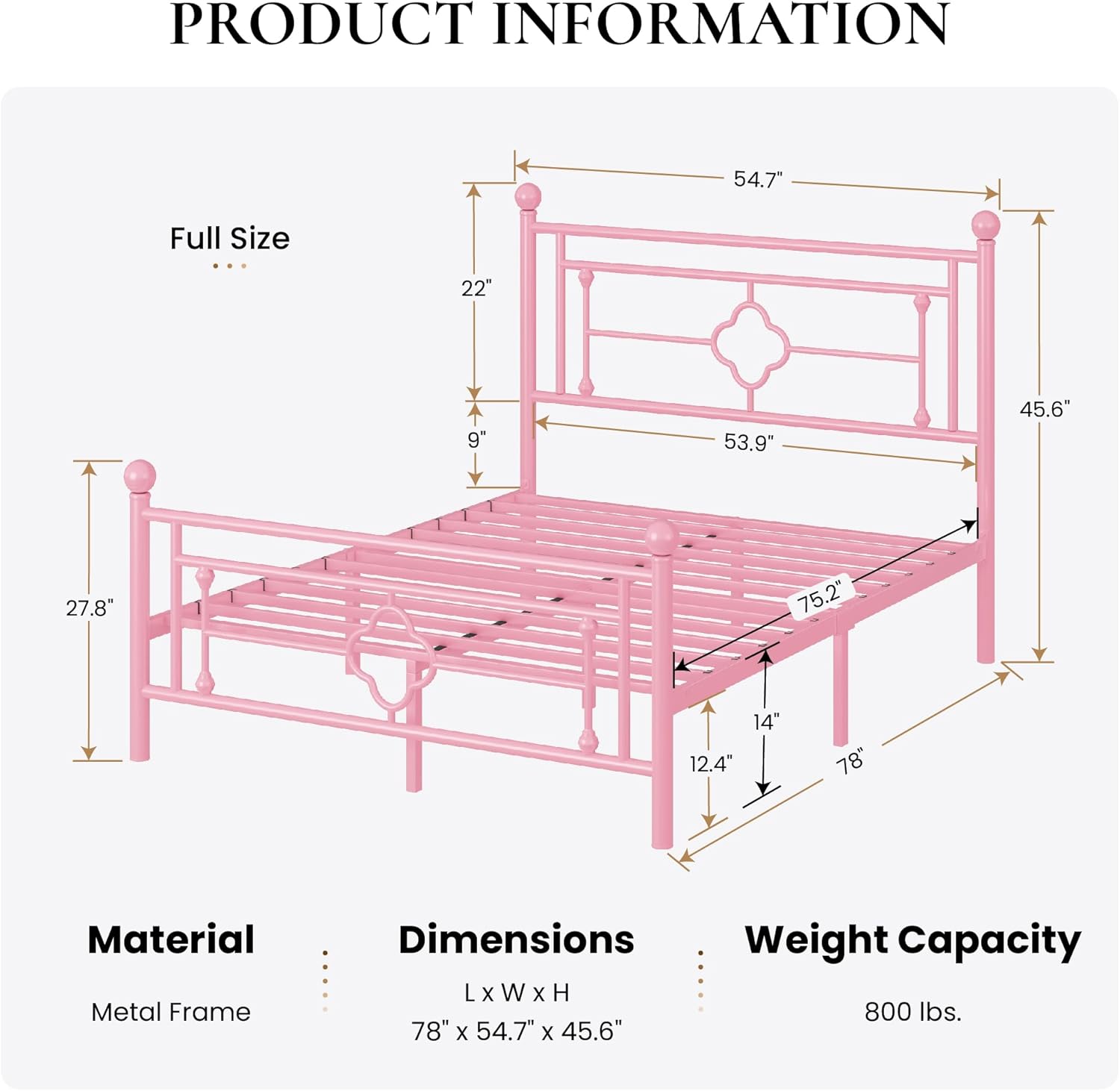 SHA CERLIN 14 Inches Full Size Metal Platform Bed Frame/Vintage Iron-Art Headboard and Footboard/Mattress Foundation for Storage/No Box Spring Needed/Noise-Free/Easy Assembly/Pink