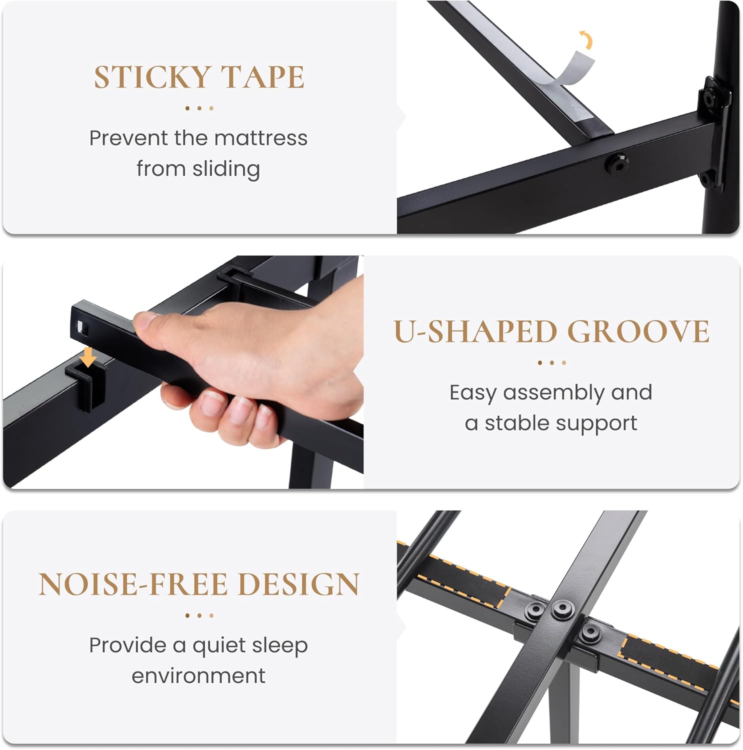 - Noise-Free: The black bed frame provides an EVA sponge to help cushion the contact between slats and reduce potential noise caused by friction. Greatly improve the quality of sleep by minimizing disturbances from creaking or rattling sounds