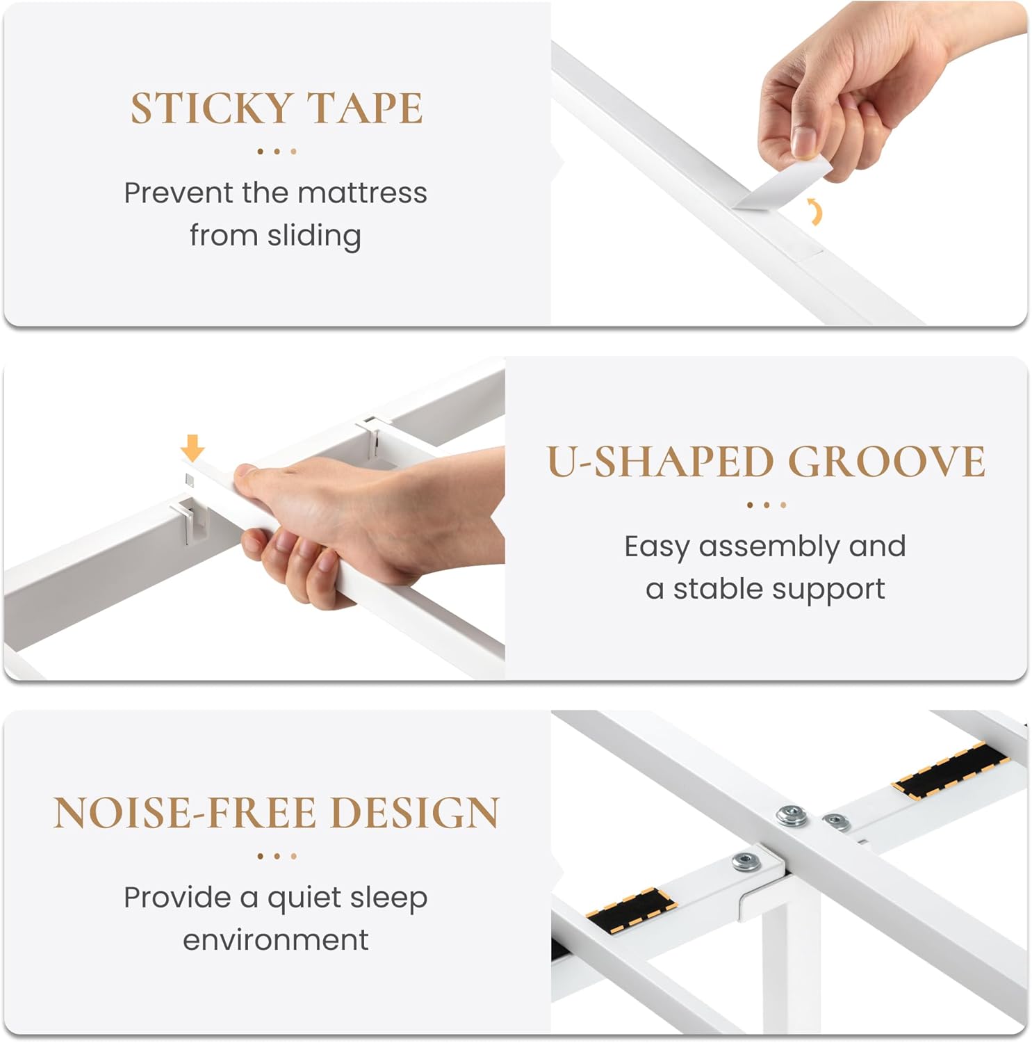 - Noise-Free:The white bed frame provides an EVA sponge to help cushion the contact between slats and reduce potential noise caused by friction. Greatly improve the quality of sleep by minimizing disturbances from creaking or rattling sounds