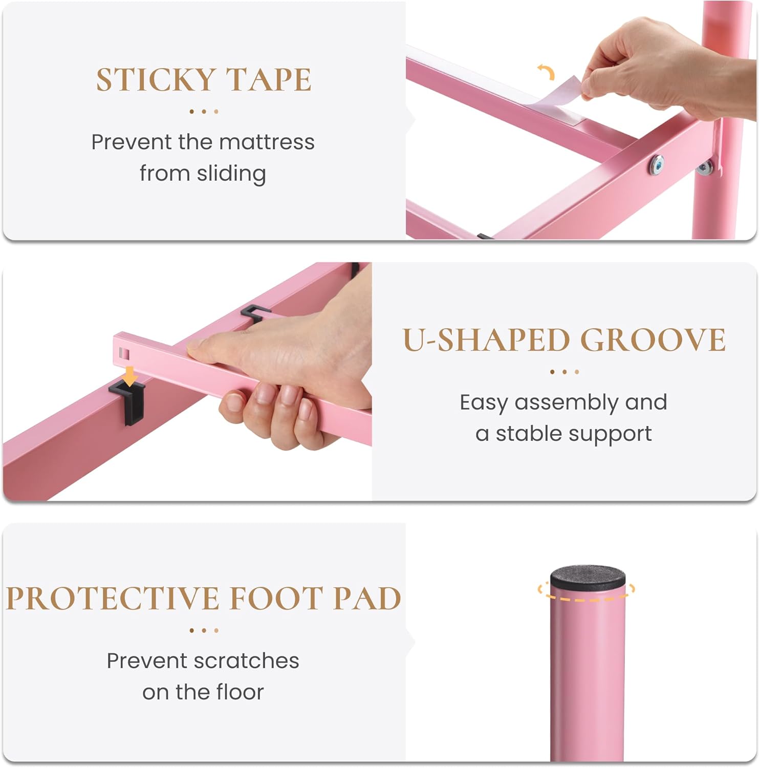 - Noise-Free: The pink bed frame provides an EVA sponge to help cushion the contact between slats and reduce potential noise caused by friction. Greatly improve the quality of sleep by minimizing disturbances from creaking or rattling sounds