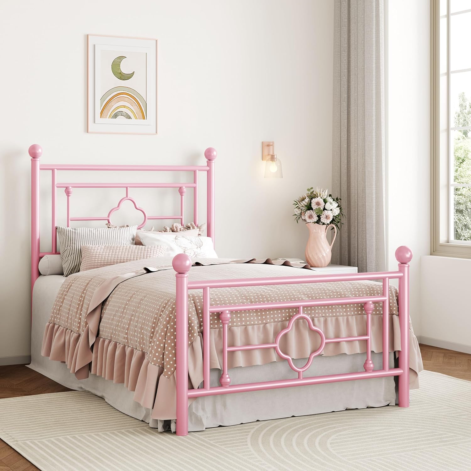 SHA CERLIN 14 Inches Twin Size Metal Platform Bed Frame/Vintage Iron-Art Headboard and Footboard/Mattress Foundation for Storage/No Box Spring Needed/Noise-Free/Easy Assembly/Pink