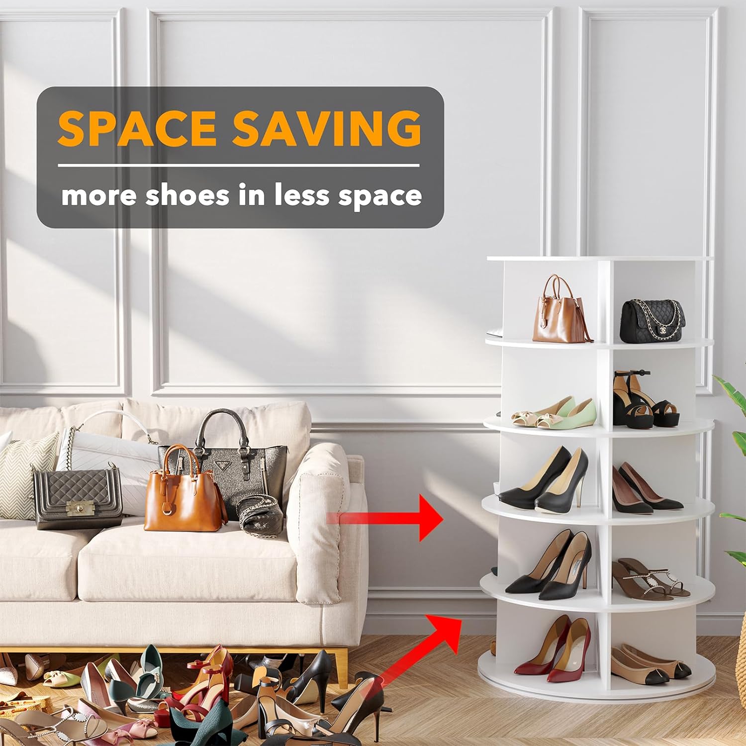 - ORGANIZED AND BEAUTIFUL - Make your shoes neat and organized with this rotating shoe rack tower lazy susan; The space saving design can hold up many shoes or bags in a compact space; SIZE: 23.2"W x 23.2"D x 45.3"H