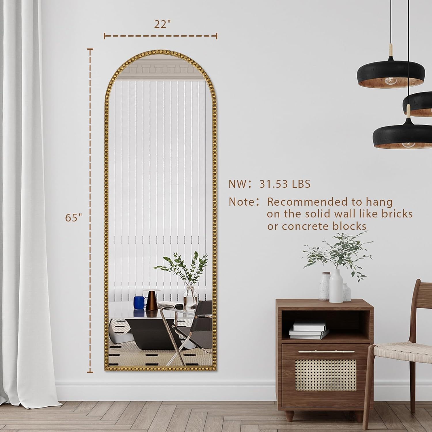 - 65"x22" Full Body Mirror- 65x22 inches mirror is a suitable size to put anywhere in your space. The large full length mirror, made of heavy duty strong cast iron with vintage gold finish, weighs 31.53 lbs. This sturdy, durable, anti-scratch, corrosion resistant and non-rusting mirror is ideal for bedroom, living room and entryway.