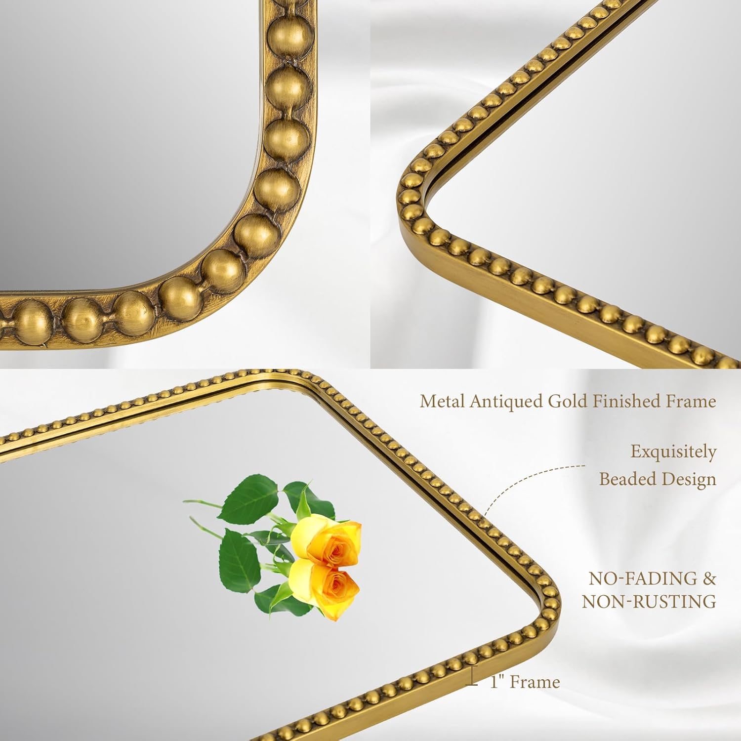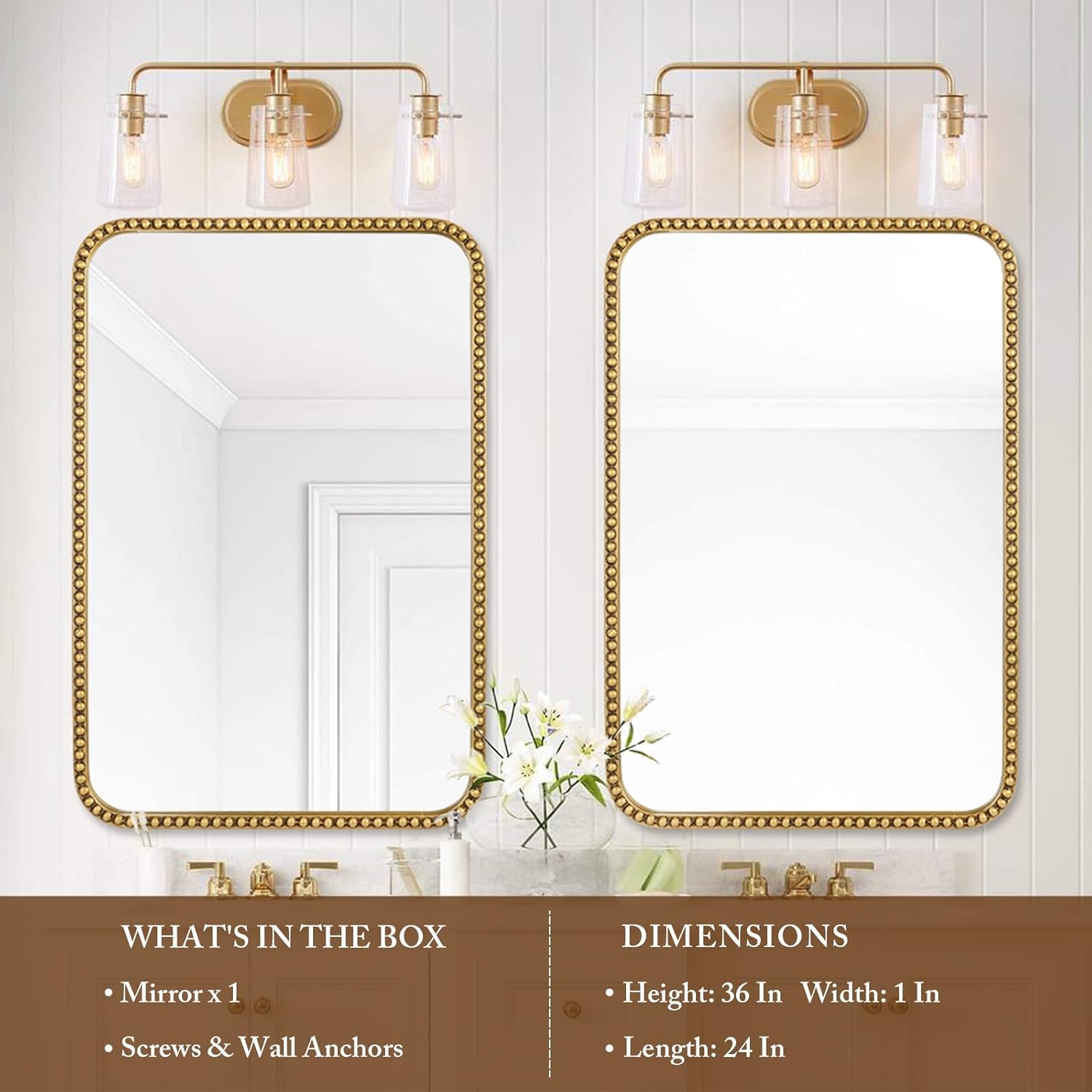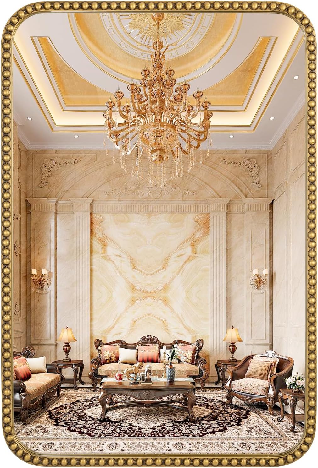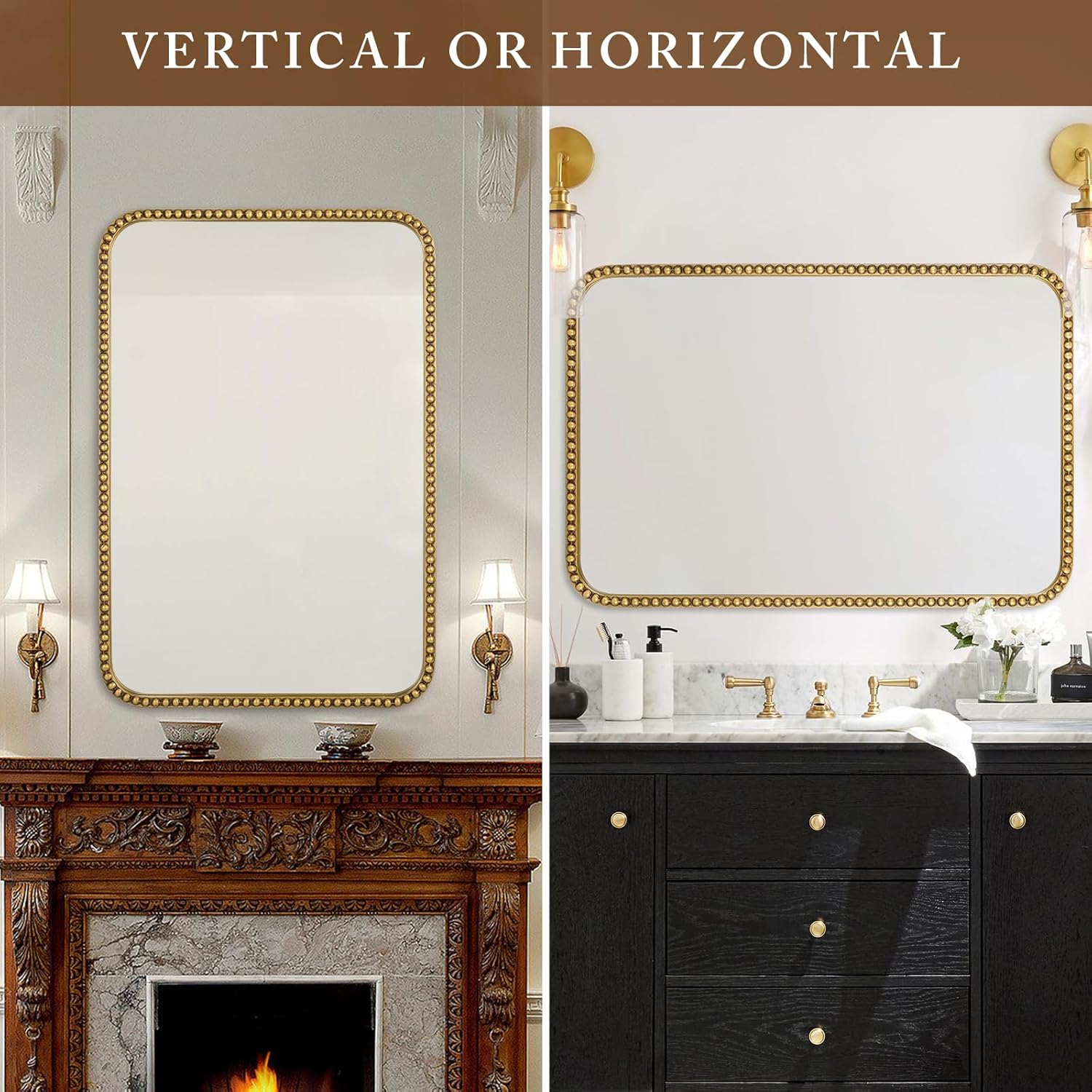 Wall Mirror for Bathroom - 24"x36" Rectangle Rounded Corner Beaded Frame Mirror, Large Vanity Mirror Hangs Horizontal or Vertical, Antique Gold