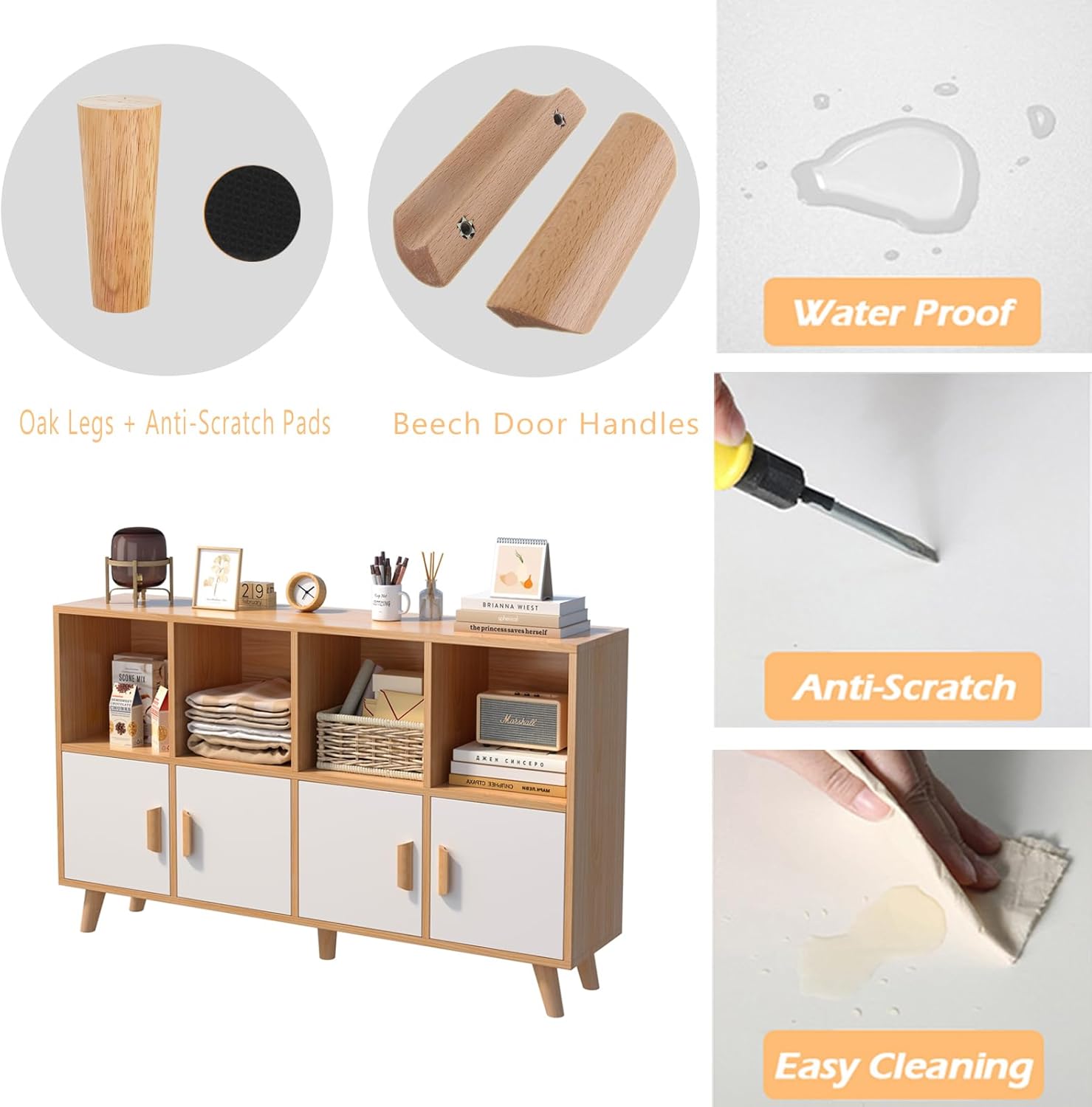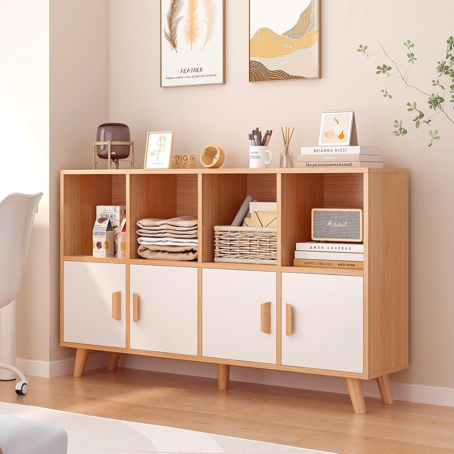 Cubby Shelf Bookcase with Doors - Wooden 8 Cube Floor Standing Open Bookshelf with Solid Wood Legs, 2-Tier Low Storage Cabinet, Oak and Warm White