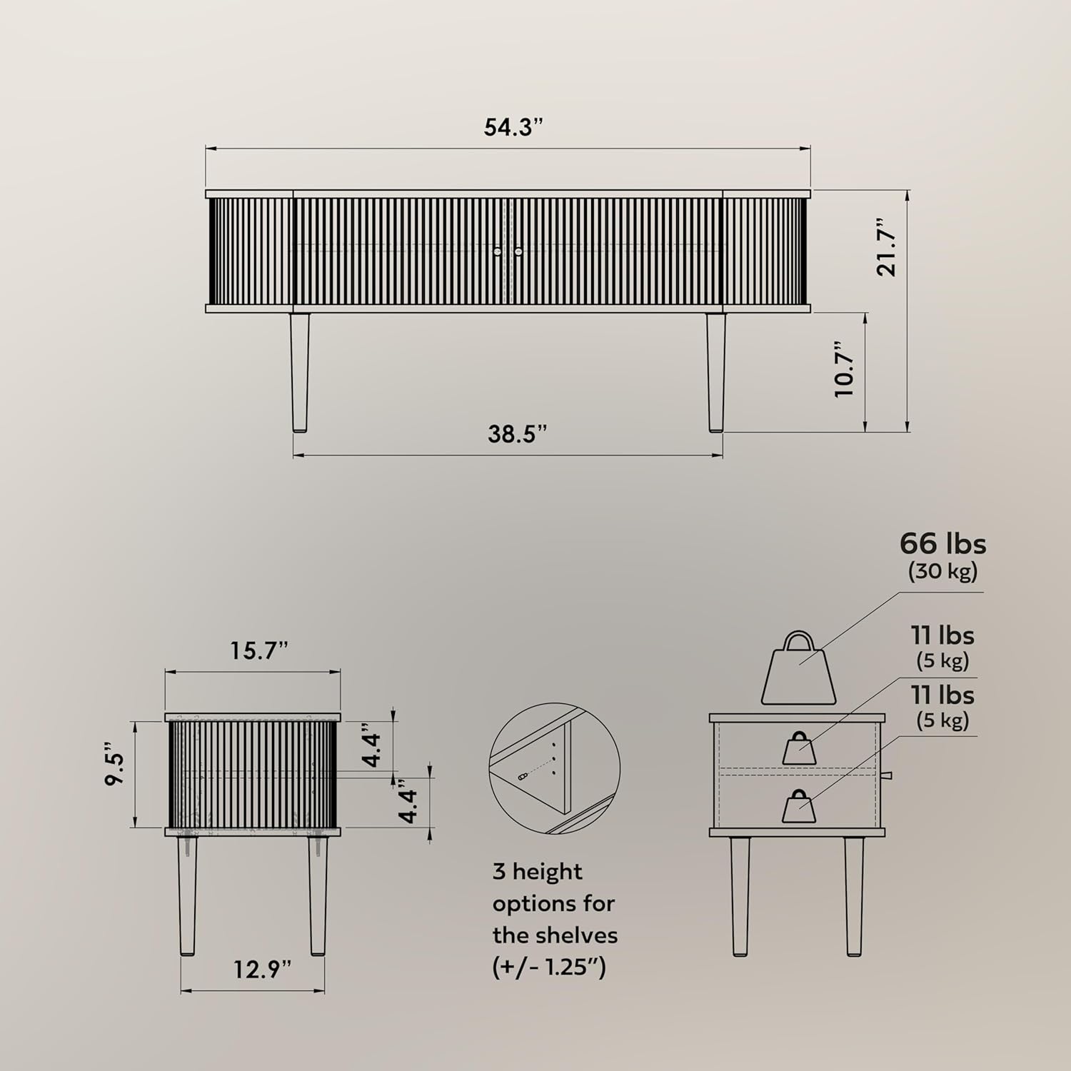 - ENJOY EFFORTLESS STORAGE as you can choose between 3 set heights for the adjustable shelf to maximize the use of the six storage spaces hidden behind the sliding doors. The black TV stand cabinet (width 54.3 ‘’ x height 21,7’’ x depth 15.7’’) offers easy access to most frequently used cables, remotes, DVDs, video games and other accessories.
