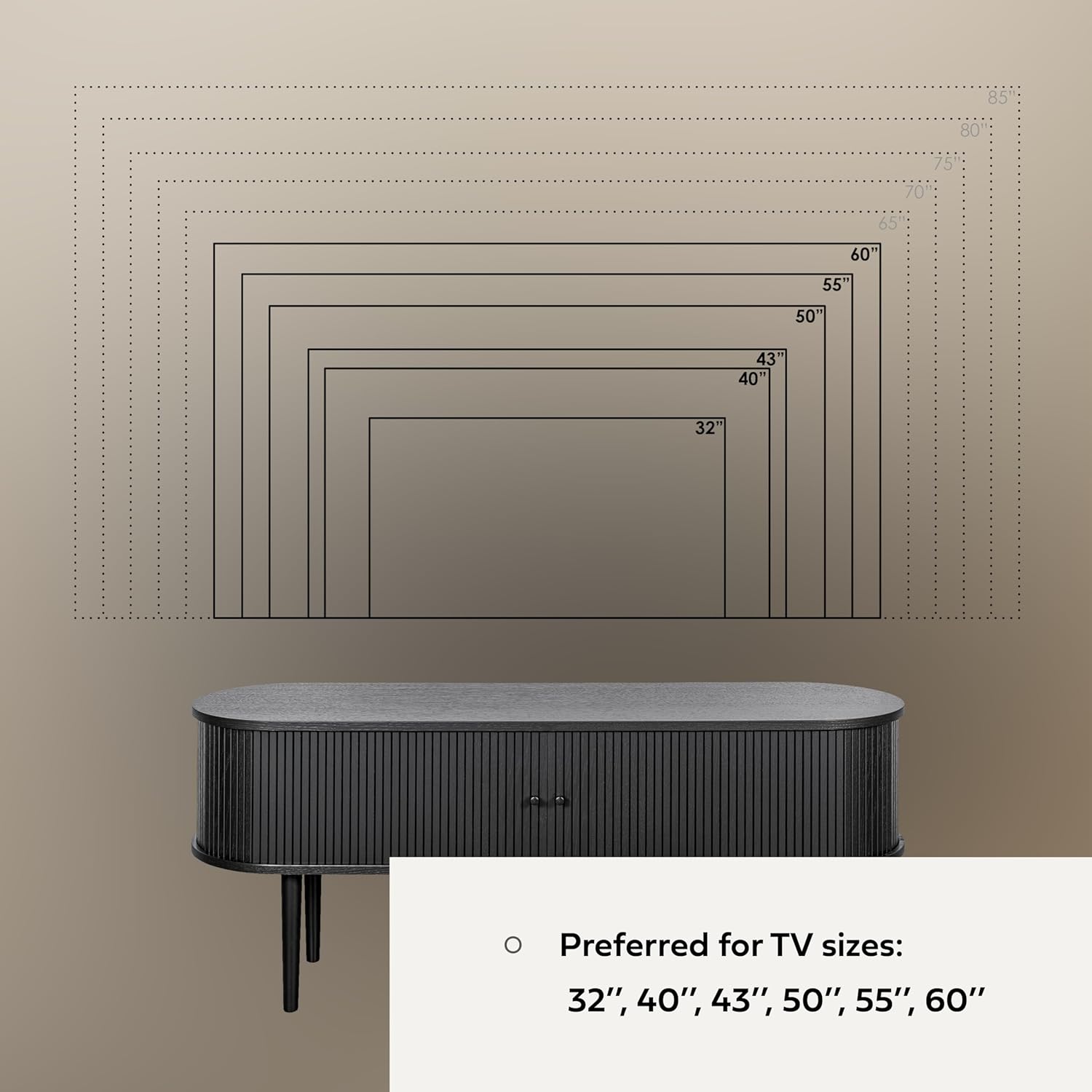 - HAVE A COMFORTABLE VIEWING EXPERIENCE as the black credenza console cabinet is suitable for TV sizes 32'' - 60'' and its height offers optimal viewing as the TV screen will be roughly at eye level when seated. Air circulation is guaranteed by the necessary openings for cables in the back wall and the bottom of the TV stand black.