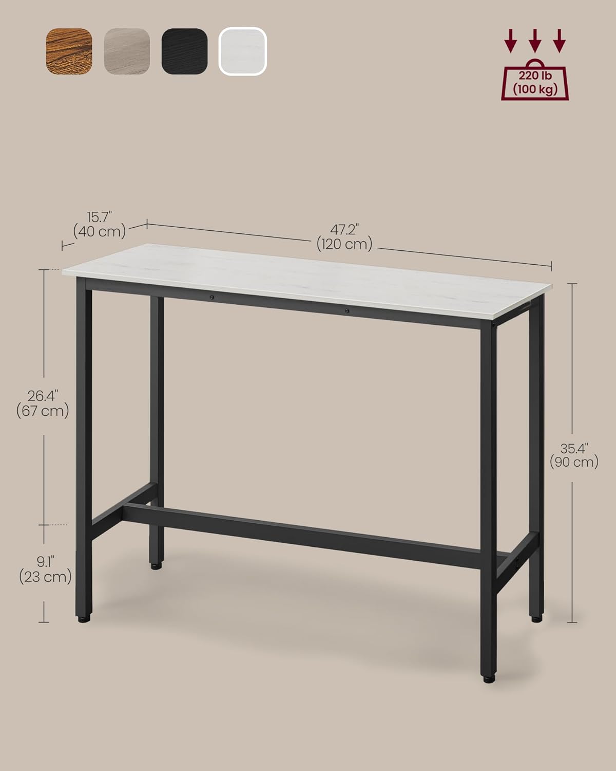 VASAGLE Bar Table, Narrow Long Kitchen Dining Table, Sturdy Metal Frame, Industrial, 15.7 x 47.2 x 35.4 Inches, Rustic White and Ink Black ULBT120B73