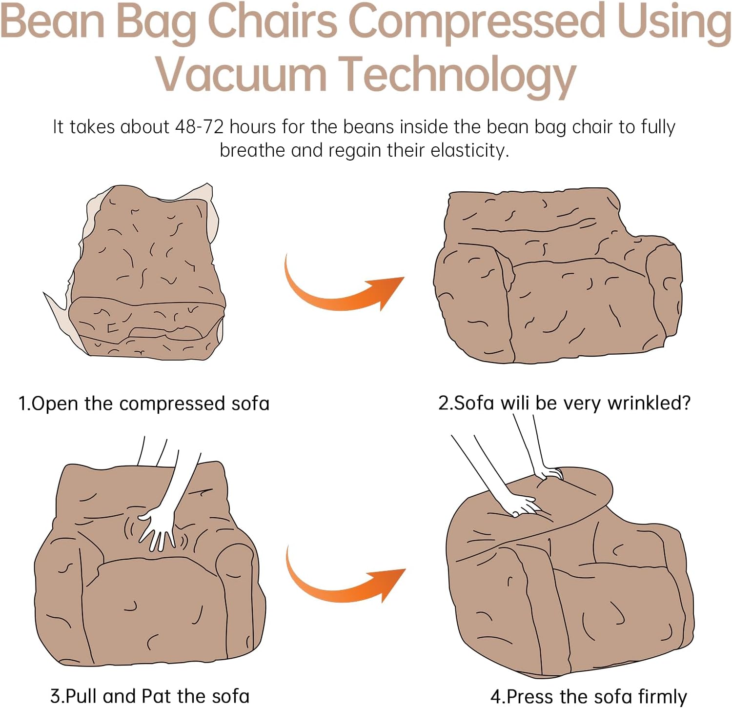 - Without Assembly Bean Bag Sofa: This comfy soft bean bag chair from us uses vacuum technology and the bean bag chair is already filled with memory foam so you don't have to refill the beans. When you receive the beanbag chair, just take it out of the box, cut off the plastic protective film, and then let it stand for about an hour, let the beans in the beanbag chair breathe freely and restore elasticity. You'll soon have a soft and comfortable beanbag sofa.