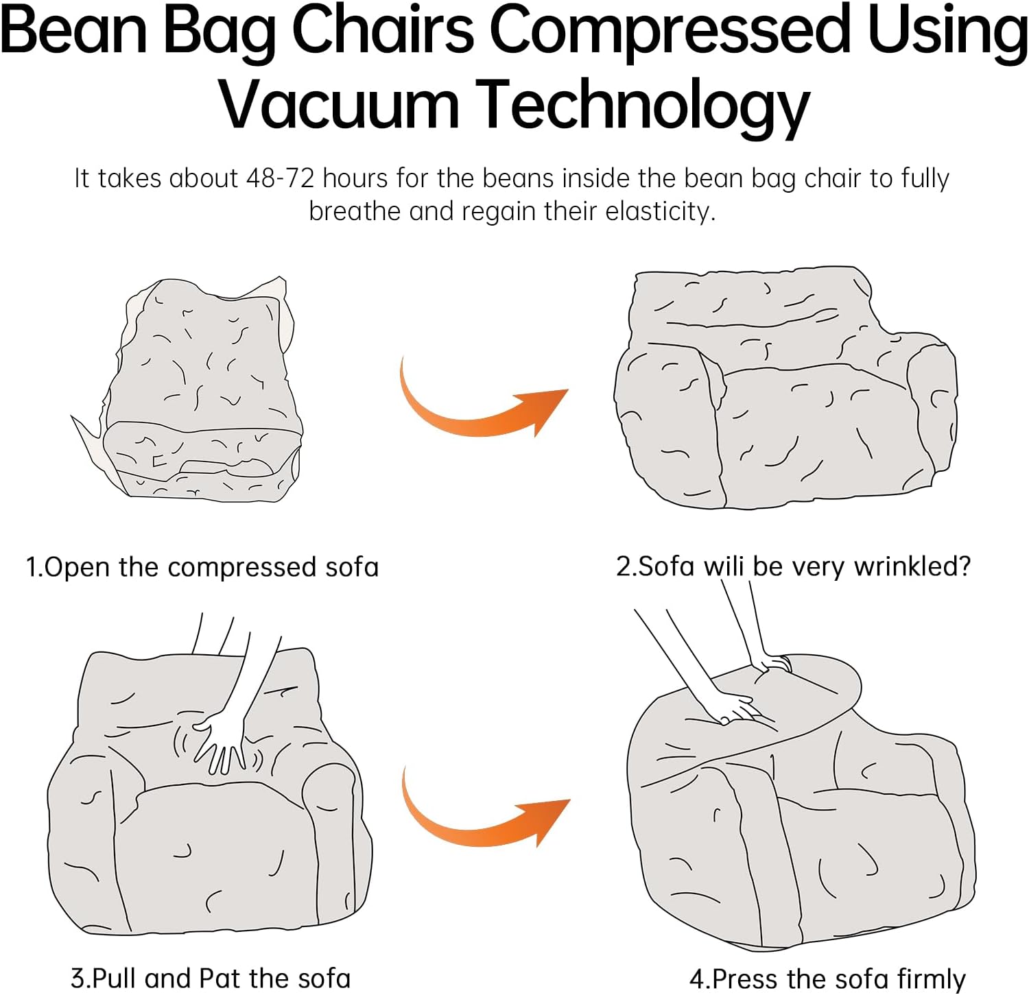- Without Assembly Bean Bag Sofa: This comfy soft bean bag chair from us uses vacuum technology and the bean bag chair is already filled with memory foam so you don't have to refill the beans. When you receive the beanbag chair, just take it out of the box, cut off the plastic protective film, and then let it stand for about an hour, let the beans in the beanbag chair breathe freely and restore elasticity. You'll soon have a soft and comfortable beanbag sofa.