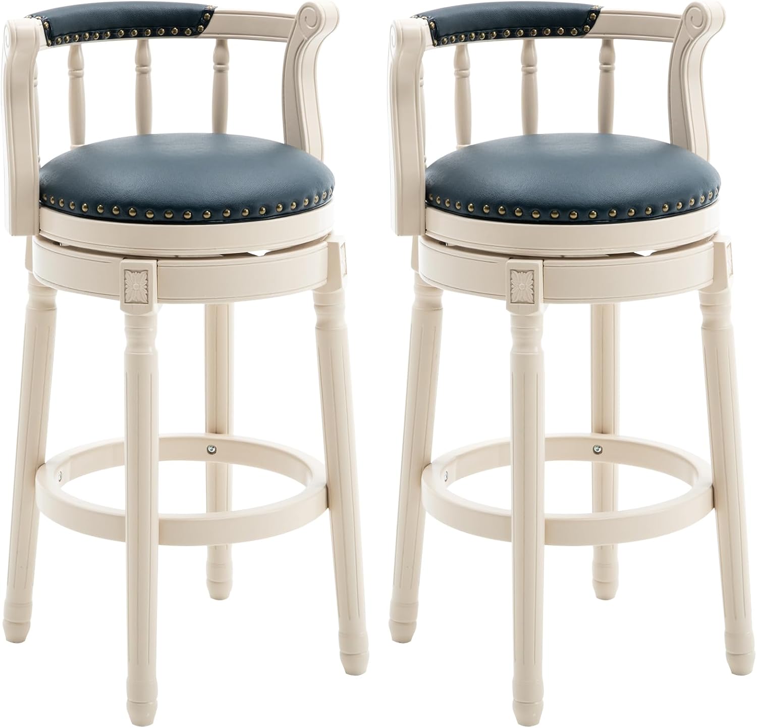 Cow top Leather Wooden Bar Stools, 360 Degree Swivel Bar Height Chair with Backs for Home Kitchen Counter, Morden Chair Barstools (Ivory Wood 2pcs-Blue Seat, Bar Height-Seat Height 29.5”)