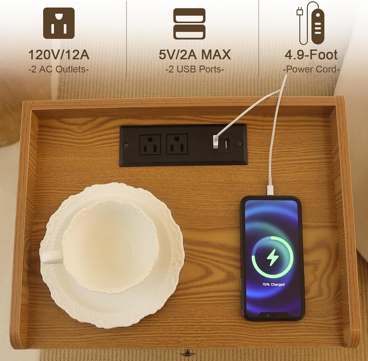 - Multifunctional Nightstand: This mid century modern nightstand with the charging station is equipped with 2 USB Ports and 2×3-Prong Power Outlets that can meet your needs to charge phones, iPads, laptops, and desk lamps easily. The 4.9-foot-long electrical cord makes phones, and ipads when charging that also is within your arm’s reach