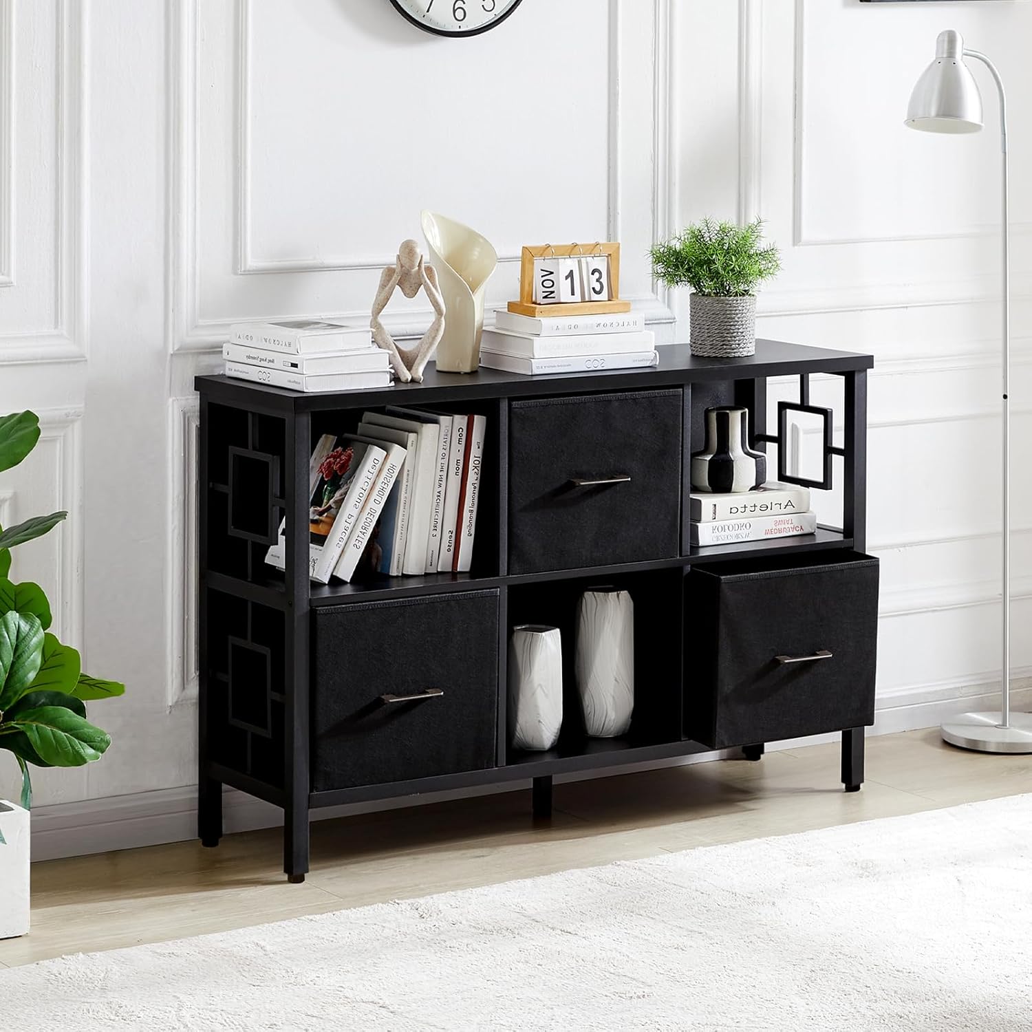 HOMISSUE 6 Cube Storage Organizer Shelf, Rustic Short Bookshelf with 3 Storage Bins, Industrial Horizontal Bookshelf with Metal Frame, Low and Wide Cube Bookcase for Living Room and Office, Black