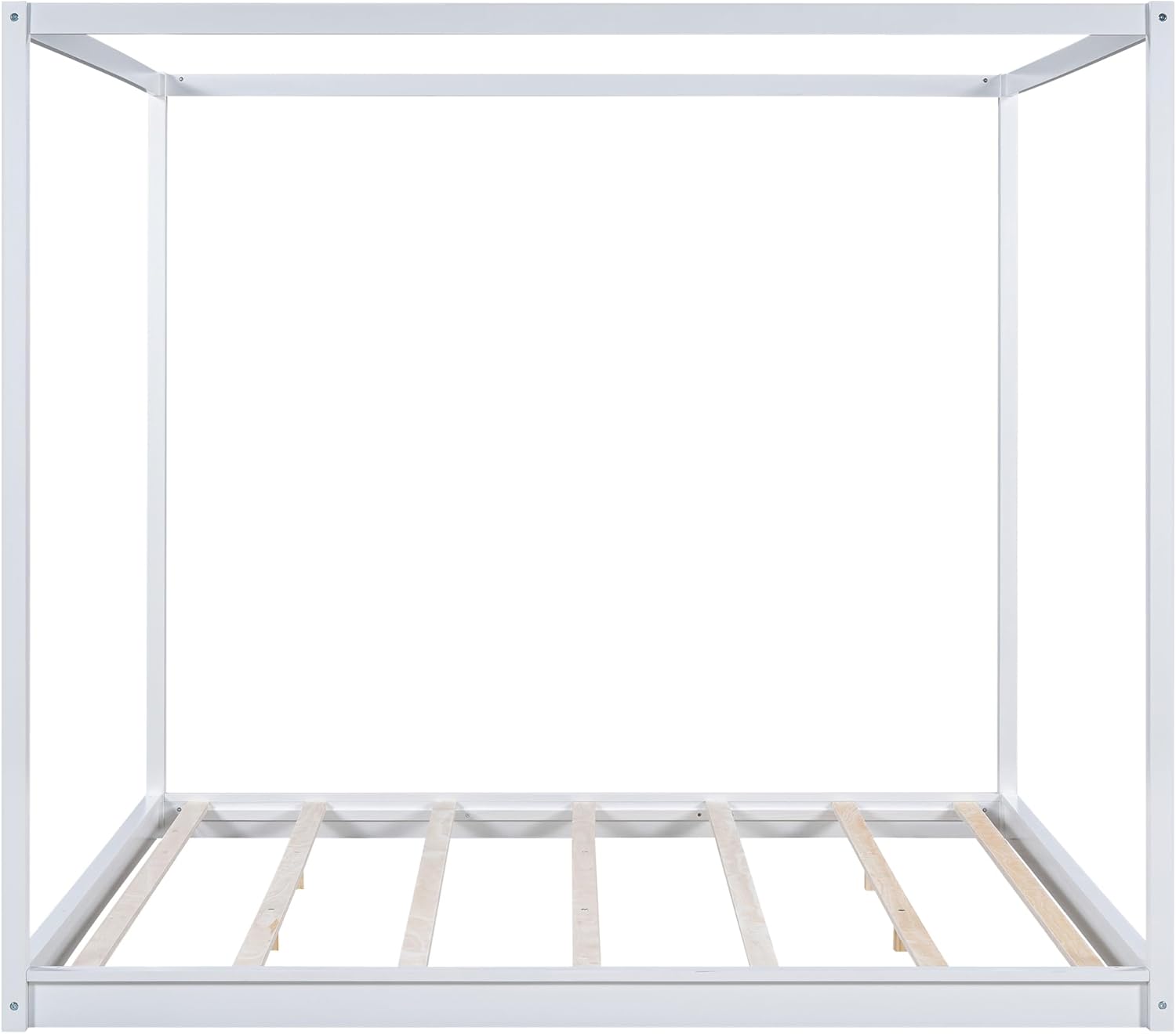 King Size Canopy Platform Bed with Support Legs,Solid Wood Bed Frame,4-Post Canopy-Platform-Bed for Kids Teens Adults, No Box Spring Needed,White