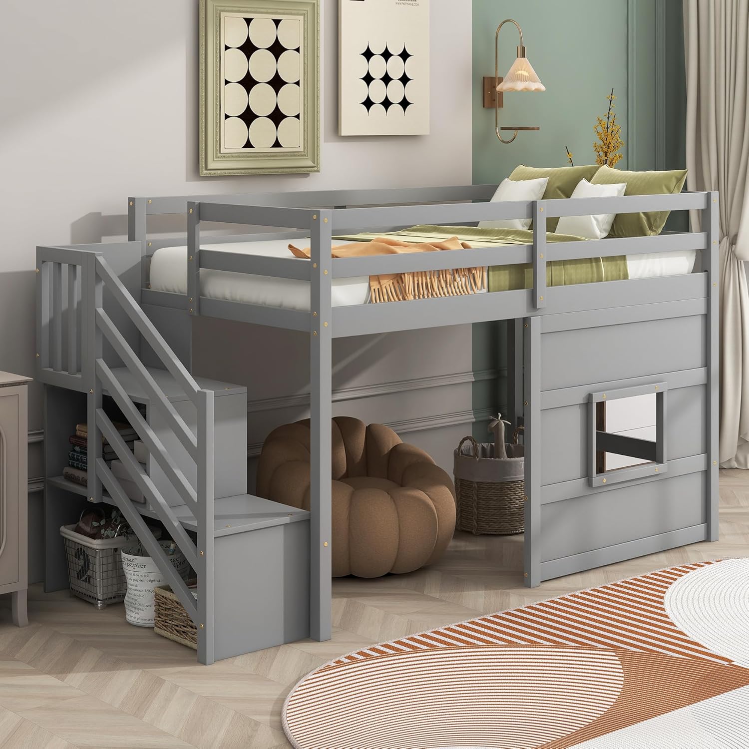 Twin Size Loft Bed with Storage Staircase and Window,Wood Twin Loft Bunk Bedframe with Full-Length Guardrail and Sturdy Slat Support, No Noise,No Box Spring Needed,for Kids,Teens,Boys,Girls,Gray