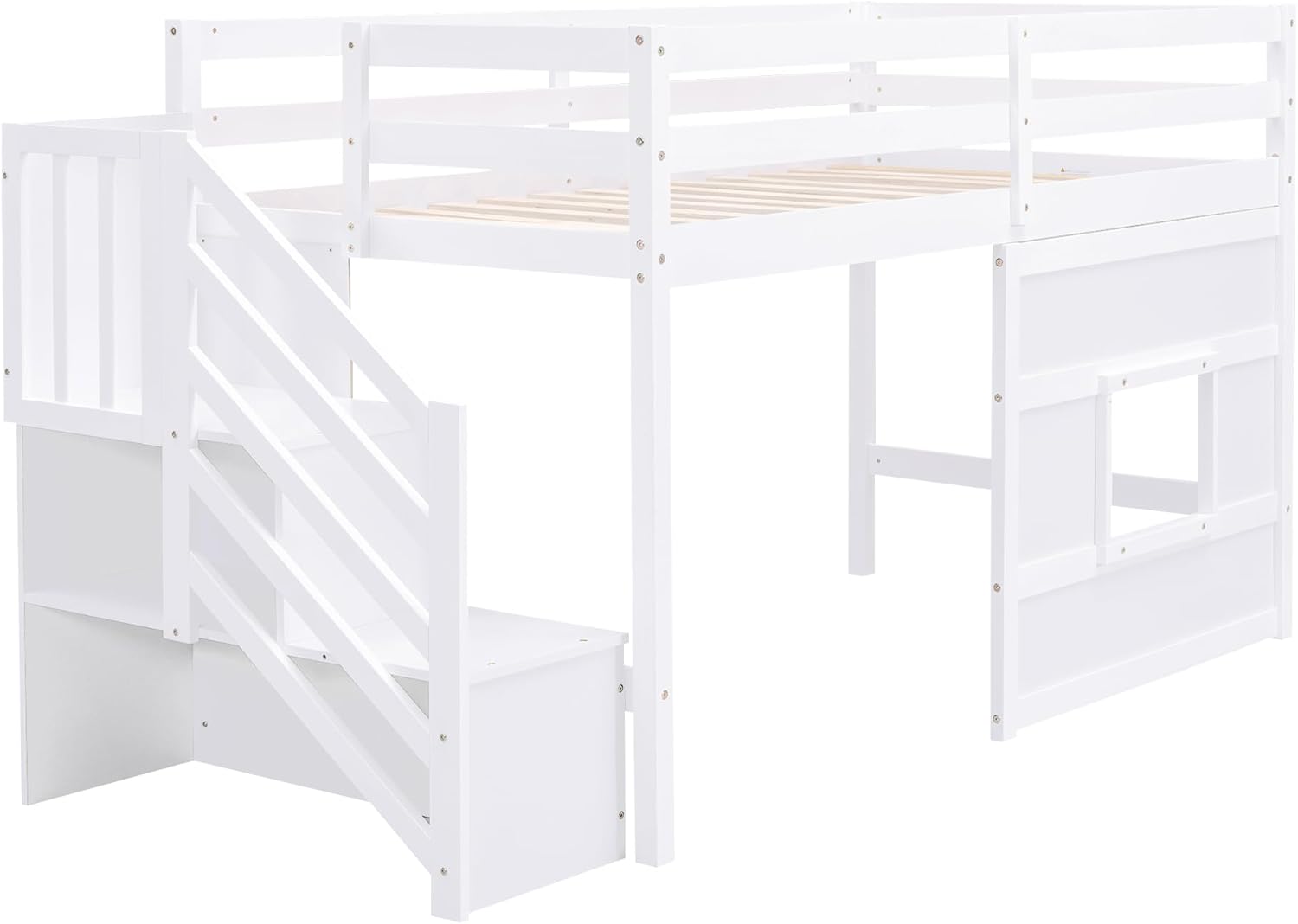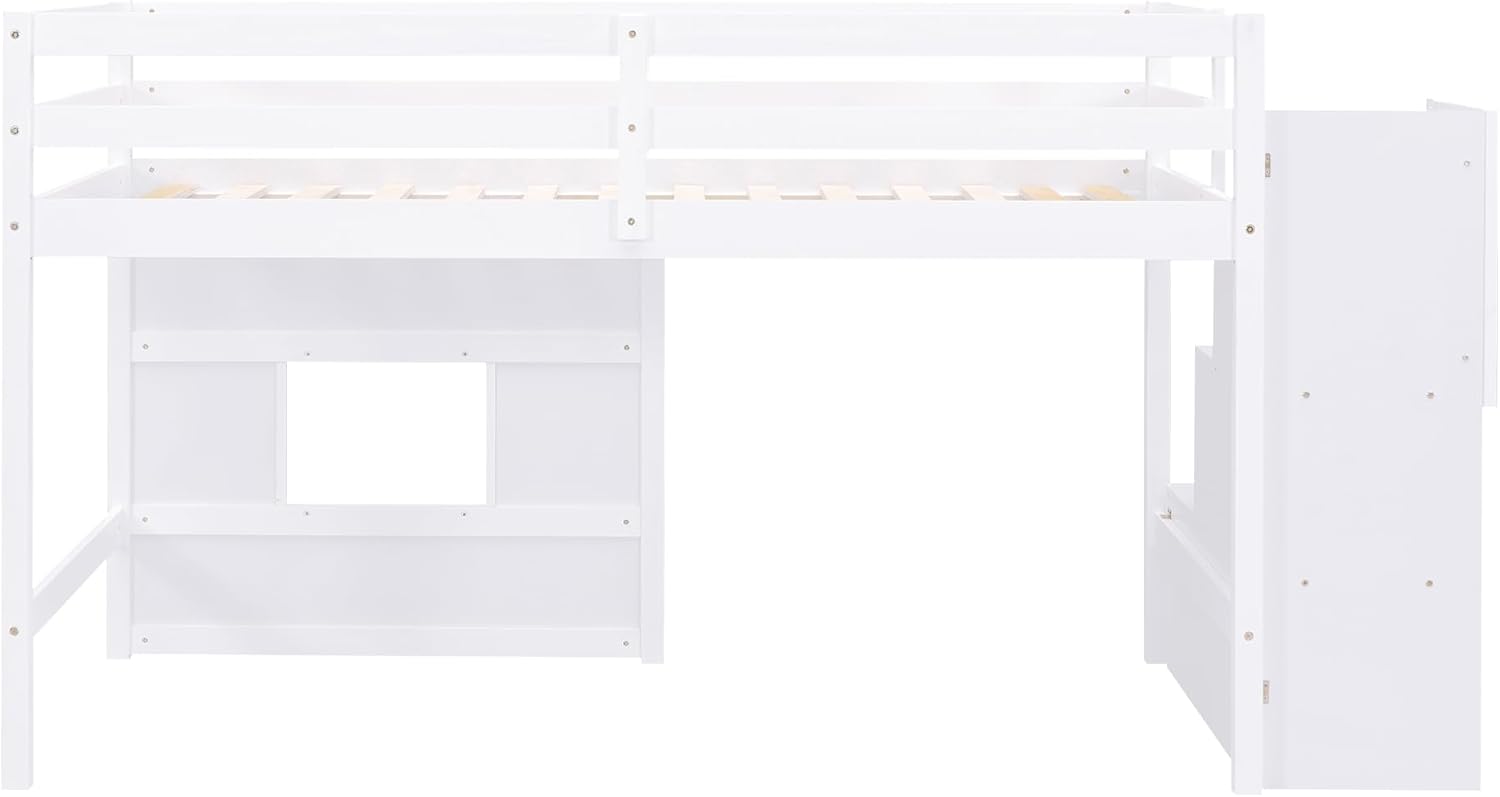 Twin Size Loft Bed with Storage Staircase and Window,Wood Twin Loft Bunk Bedframe with Full-Length Guardrail and Sturdy Slat Support, No Noise,No Box Spring Needed,for Kids,Boys,Girls,White