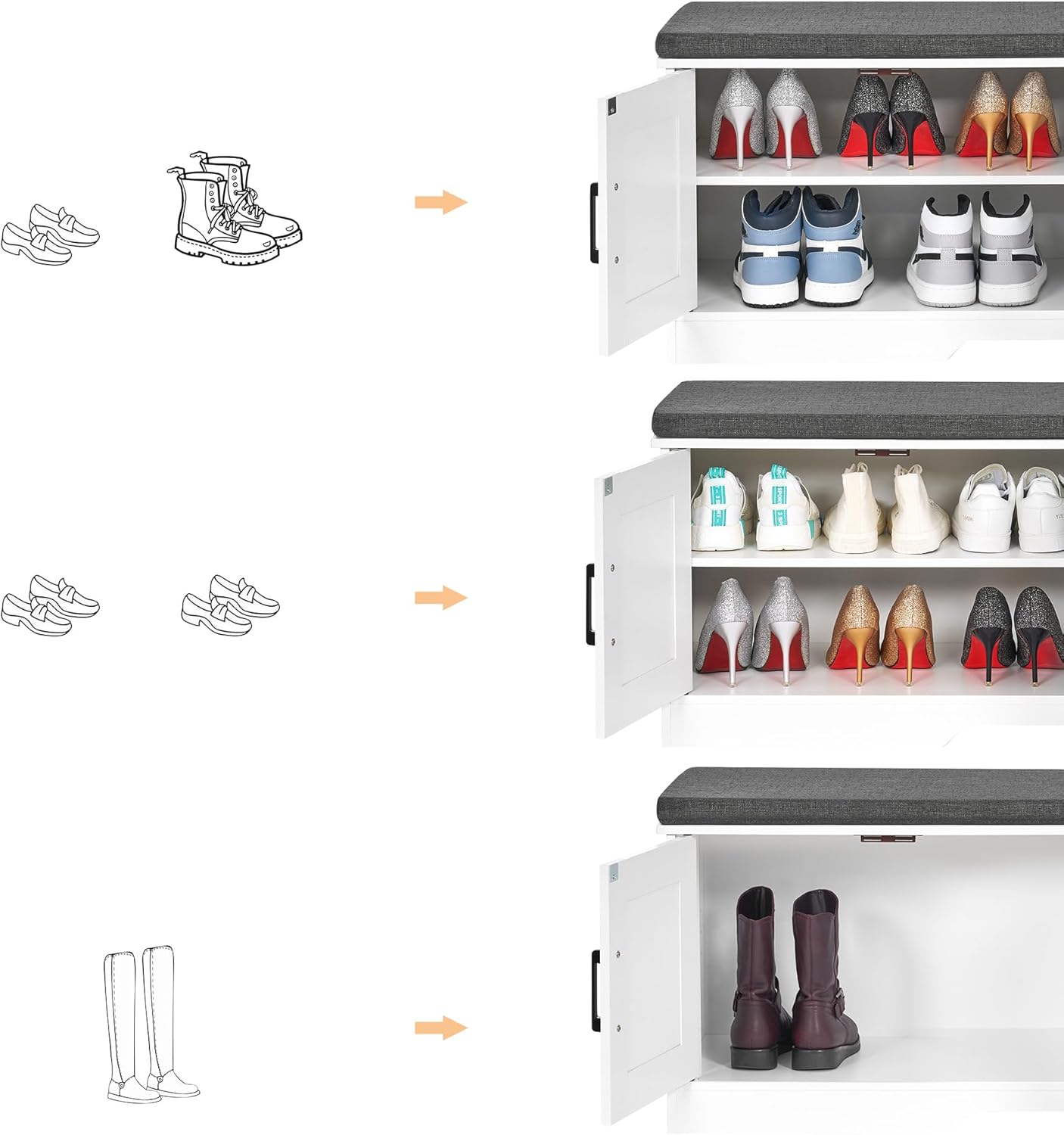 - Keep Your Shoes Organized: The depth of bench is 13.8 inches, which makes it easily to put in your shoes, meanwhile shoes of various heights can be placed by adjusting middle movable boards. The bench doors design ensures not only your privacy, but also a tidy space