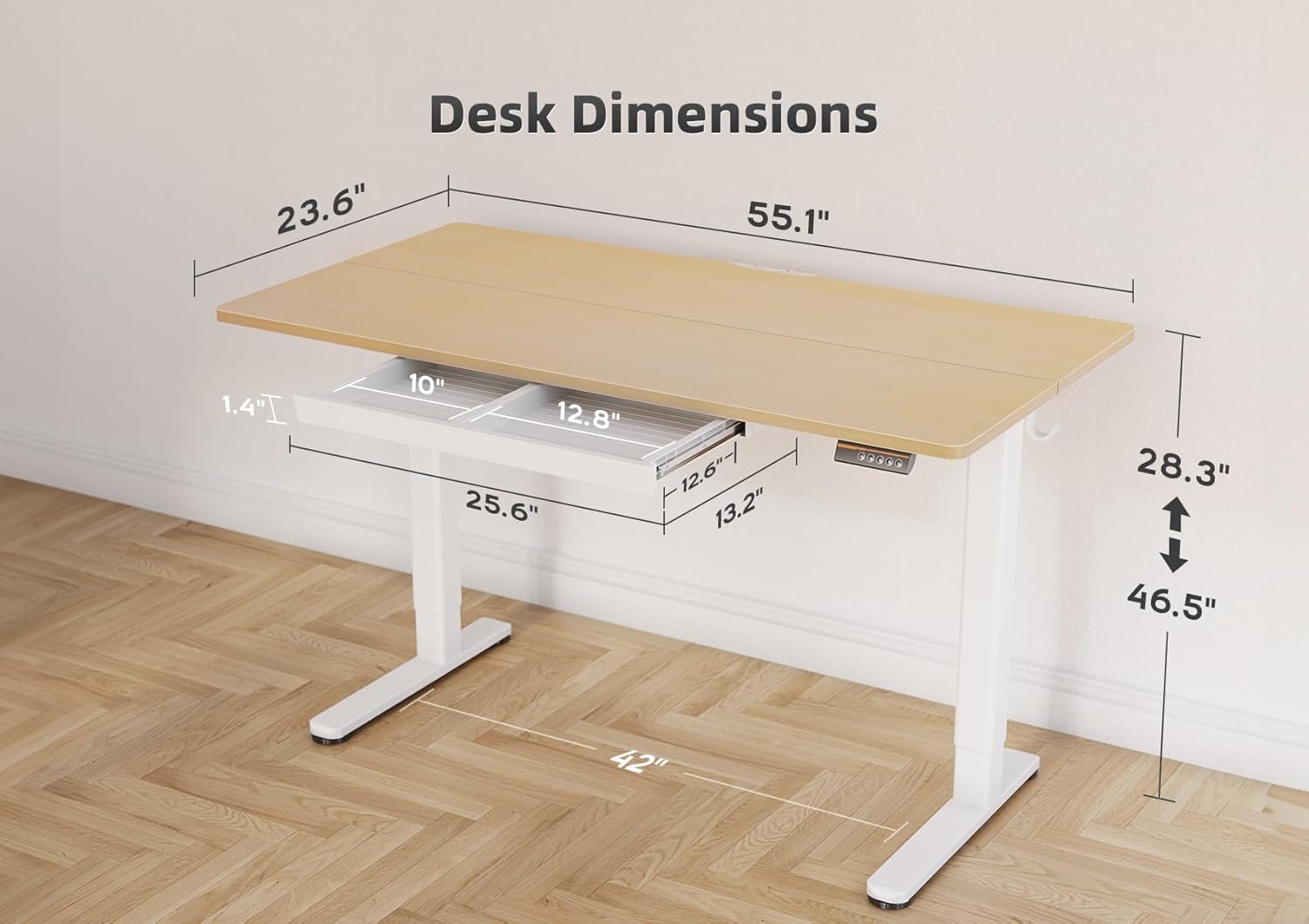 - Adjustable Height: The electric desk enjoys the freedom to your preferred height, ranging from 28.3 inches to 46.5 inches. The sit to stand desk is equipped with three preset height adjustment controllers, allowing you to customize and save your height preferences, and easily switch between them