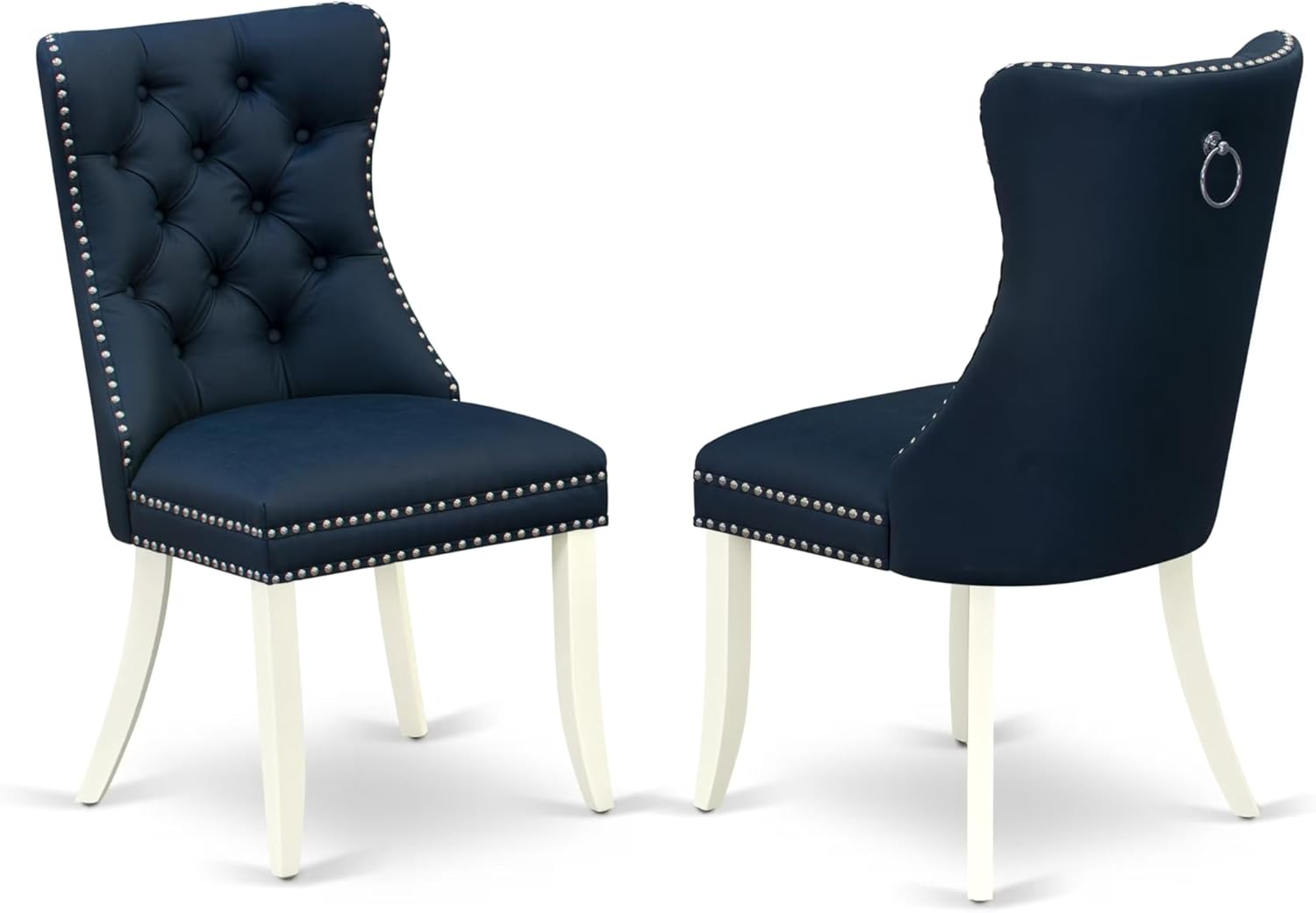 - KITCHEN TABLE SET FINISH: The classic wooden dining table with its linen white finish and The Polyester Fabric kitchen chairs in a Navy Blue shade bring an element of elegance to any dining space, serving as a wonderful inclusion to diverse interior design aesthetics. The unified design of The kitchen table set establishes a sense of balance, perfect for both dining and hosting occasions. This choice of light and breezy colors infuses a hint of vibrancy into The dining area, effortlessly enhancing a variety of interior design Themes.