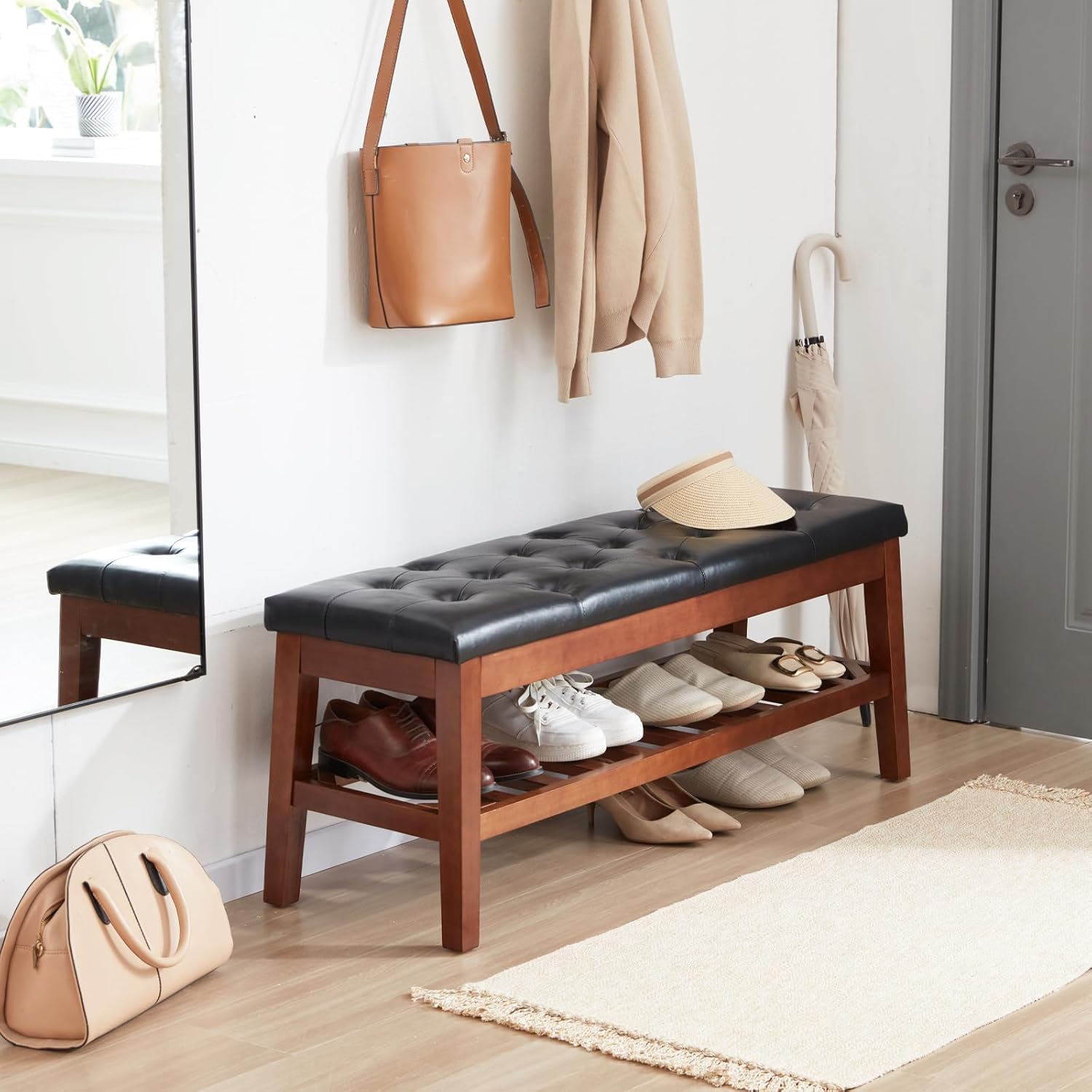 Upholstered Shoe Bench Entryway Bench for Bedroom, End of Bed, Ottoman Bench Tufted Padded Seat with Solid Wood Shelf for Living Room, Faux Leather Black