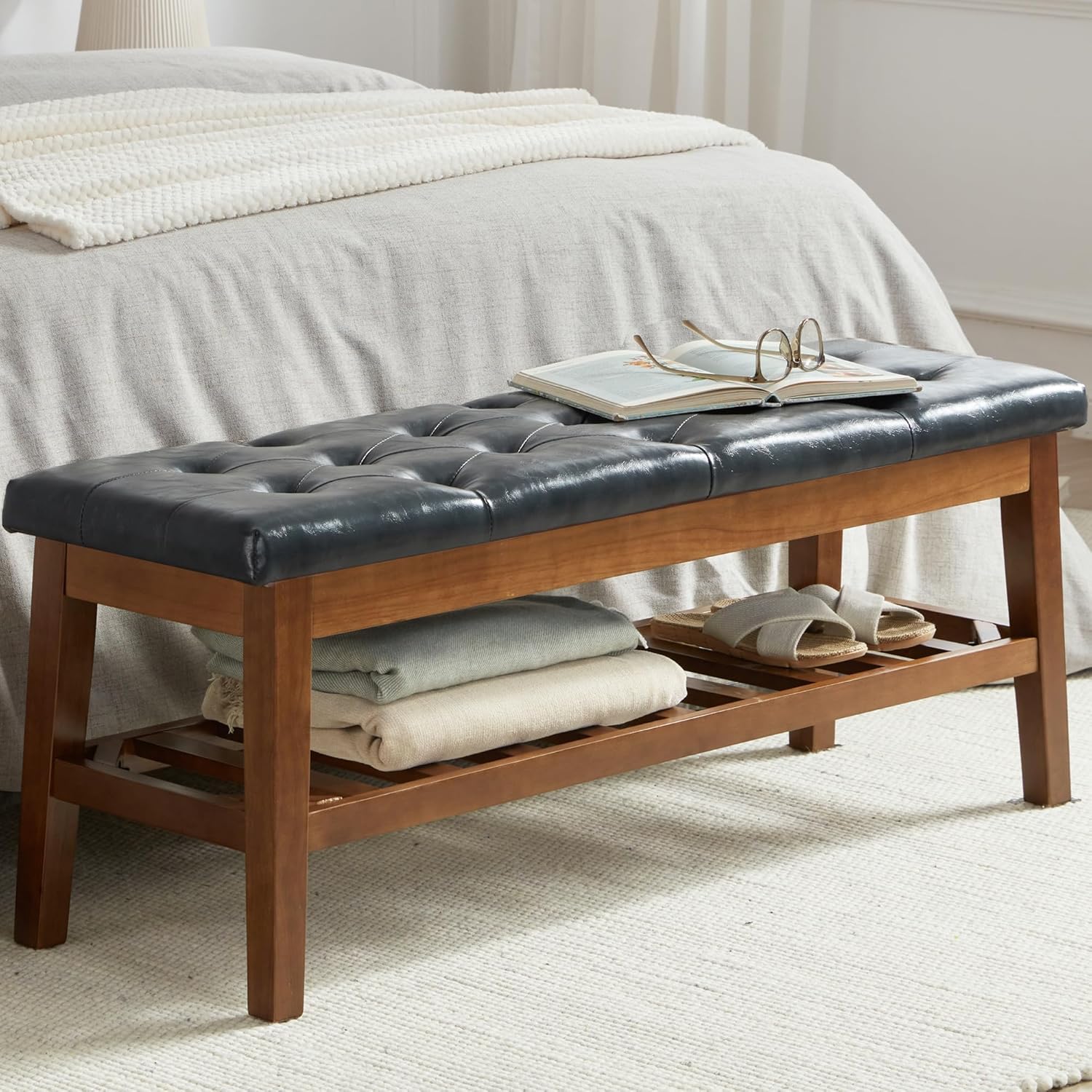 Upholstered Shoe Bench Entryway Bench for Bedroom, End of Bed, Ottoman Bench Tufted Padded Seat with Solid Wood Shelf for Living Room, Faux Leather Ink Blue