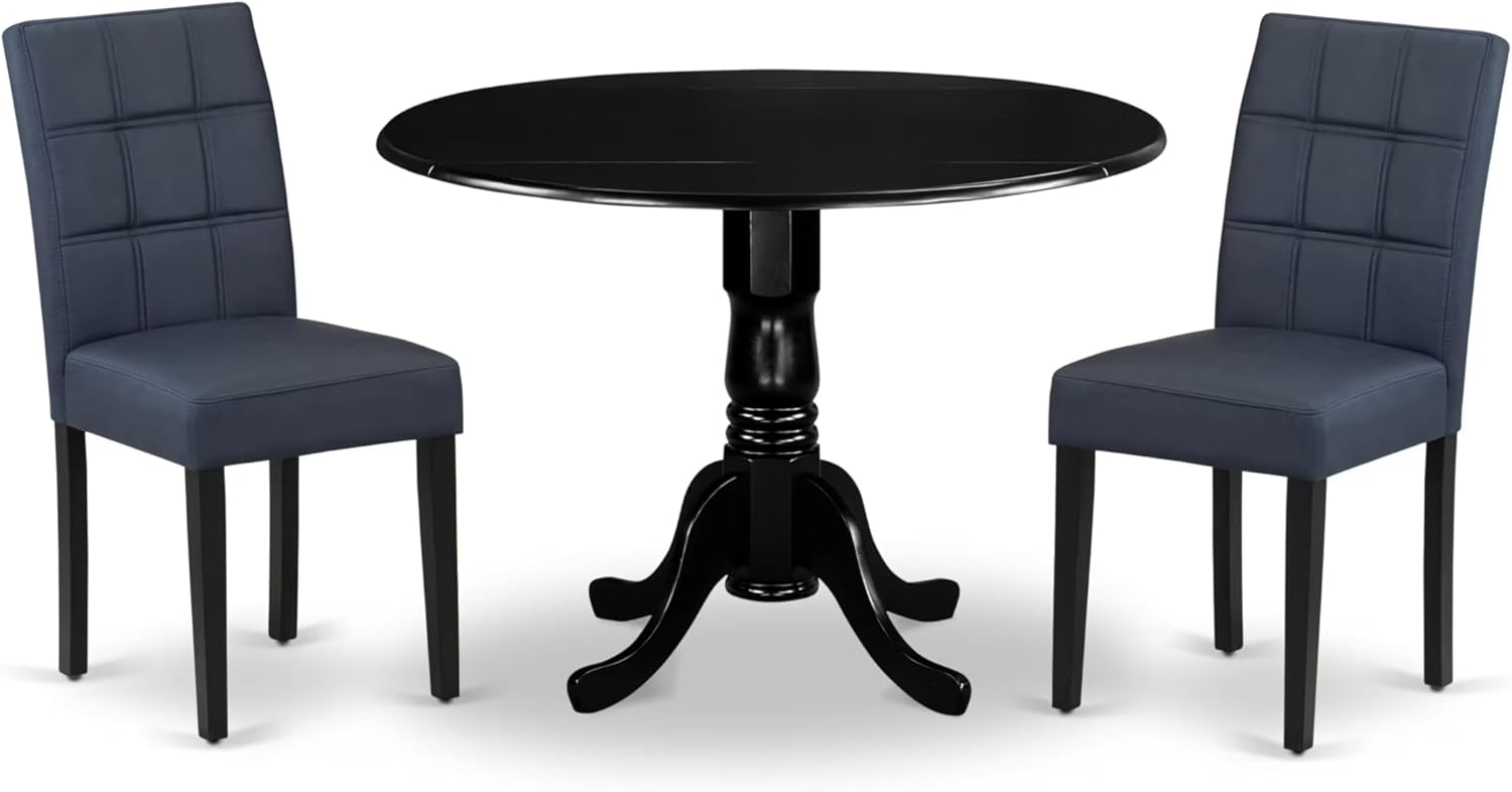 East West Furniture DLAS3-BLK-09 3 Piece Dining Table Set consists A Wood Table and 2 Dark Navy Blue Polyester Fabric Parson Dining Chair with Stylish Back- Black Finish