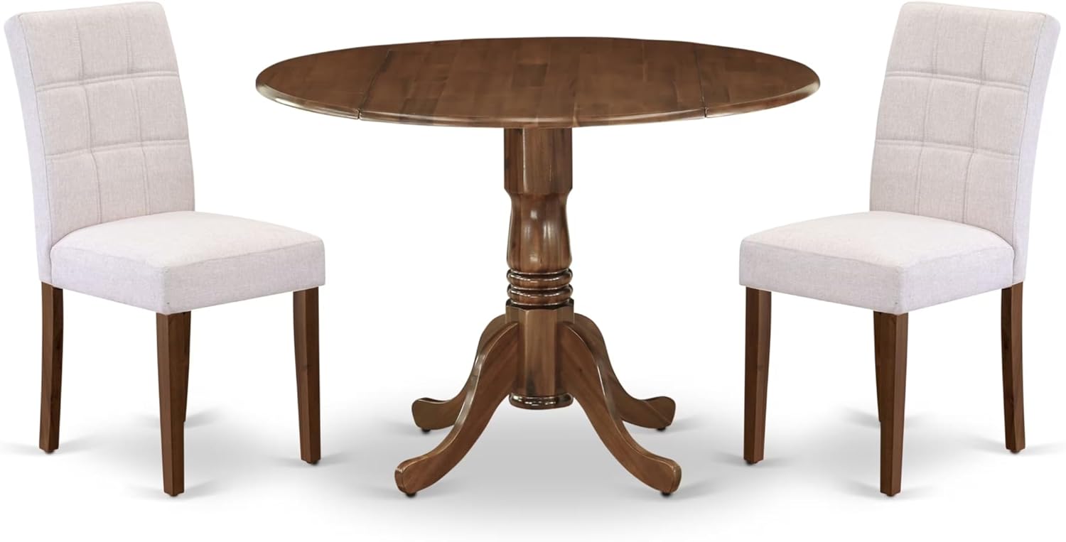 East West Furniture DLAS3-AWA-08 3 Piece Dinner Table Set Includes A Mid Century Modern Table and 2 Mist Beige Polyester Fabric Dinning Chairs, Antique Walnut