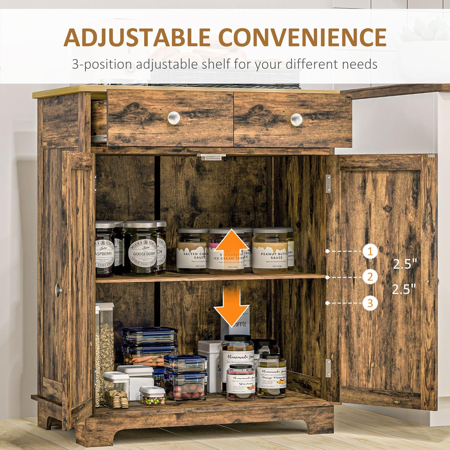 - Roomy Storage: This buffet cabinet utilizes 2 large drawers for utensils or napkins and 2-tiers offering storage space for plates, plastic containers, pots, or pans. Keep organized behind doors so your items stay safe and dust-free. The shelf inside is 3-level adjustable to meet various storage needs.