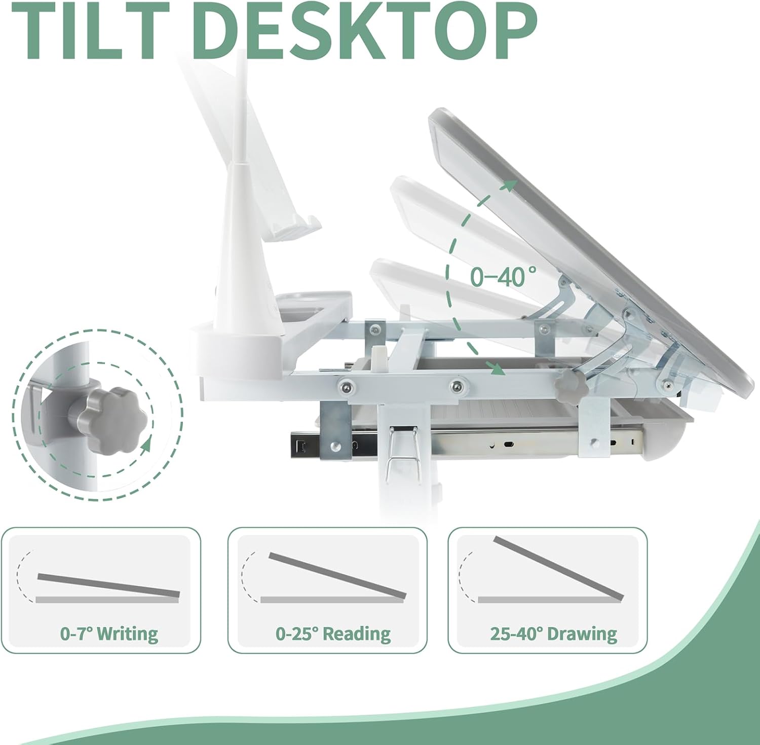 - 【Ergonomic Comfort Tiltable Desktop】The tiltable desktop allows your child to customize the angle(0~40°) of their study surface, promoting a healthy posture and reducing strain on their neck and back. It's a fantastic feature that ensures optimal comfort during long study sessions. Besides, this desk is equipped with anti-pinch stoppers to prevent hands from being pinched when kids rotate the desk.