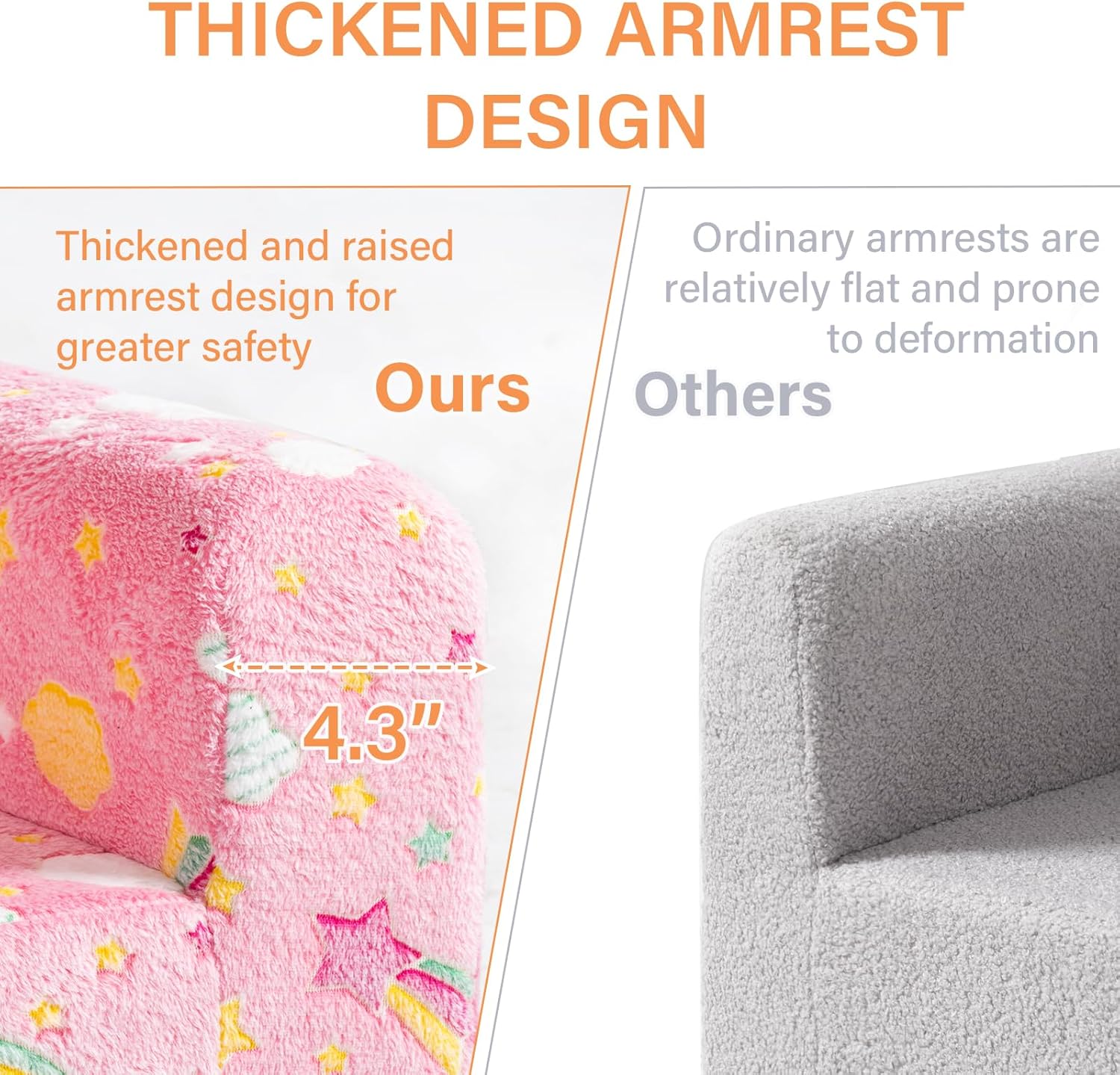 - 【Cloud-Like Back Support】This fluffy toddler chair is especially designed for little ones. Sitting in this fluffy toddler chair like snuggling a shining cloud. Toddler armchair cover is made of safe & skin-friendly durable cotton, we've utilized upgraded high-density sponge to enhance the durability and reliability of the kids chair, ensuring optimal protection for your child. So they will play games, eat snacks, watch TV, reading or just lie down and rest on the sofa.
