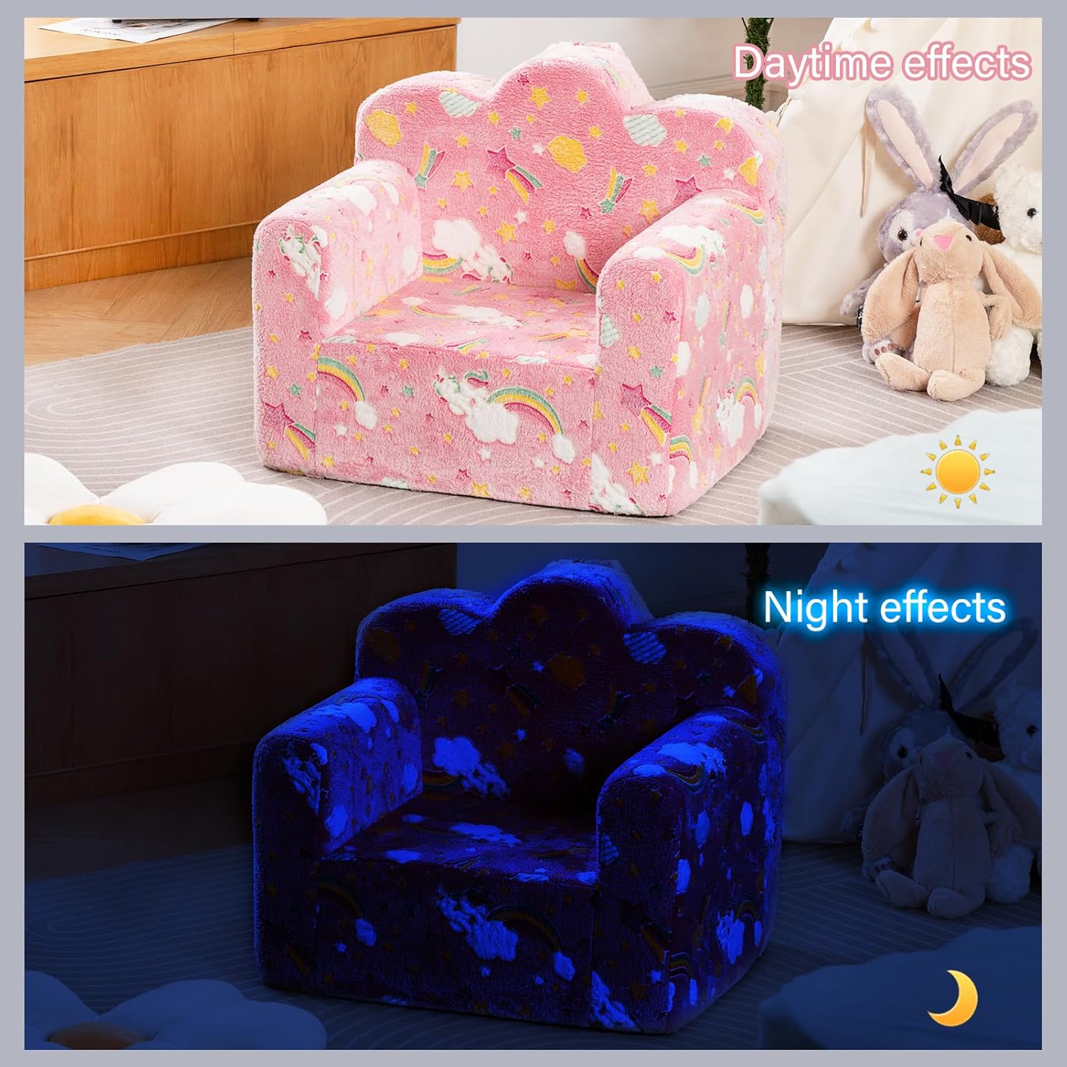 - 【Toddler Sofa Glow in The Dark】Unique luminous design. With four exciting themes to choose from, including star,green dinosaur,rainbow and blue dinosaur. Simply place the toddler sofa under a bright light or sunlight for 10-15 minutes and bring it to a dark room to see the magic glow. The brighter the light shines, the stronger it glows in the dark.