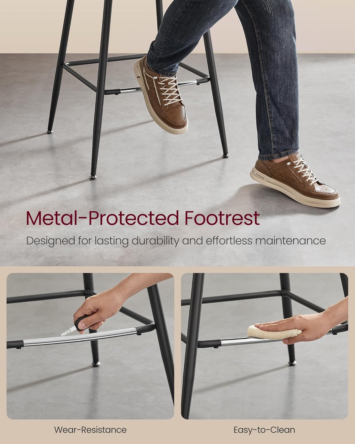 - [Durable Footrest with Metal Protection] Each of these breakfast stools features a metal-protected footrest, designed for durability and ease of cleaning, even when stepped on with shoes