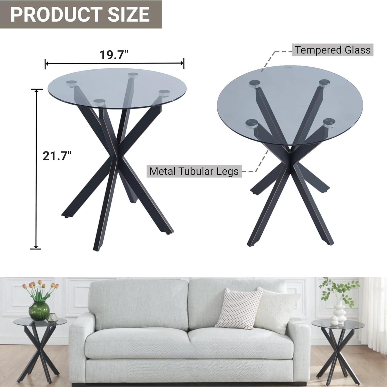 - Tempered Glass: Our modern round side table use a hard wearing grey tempered glass top, offers durability, enhanced safety, thermal resistance, and excellent transparency for you