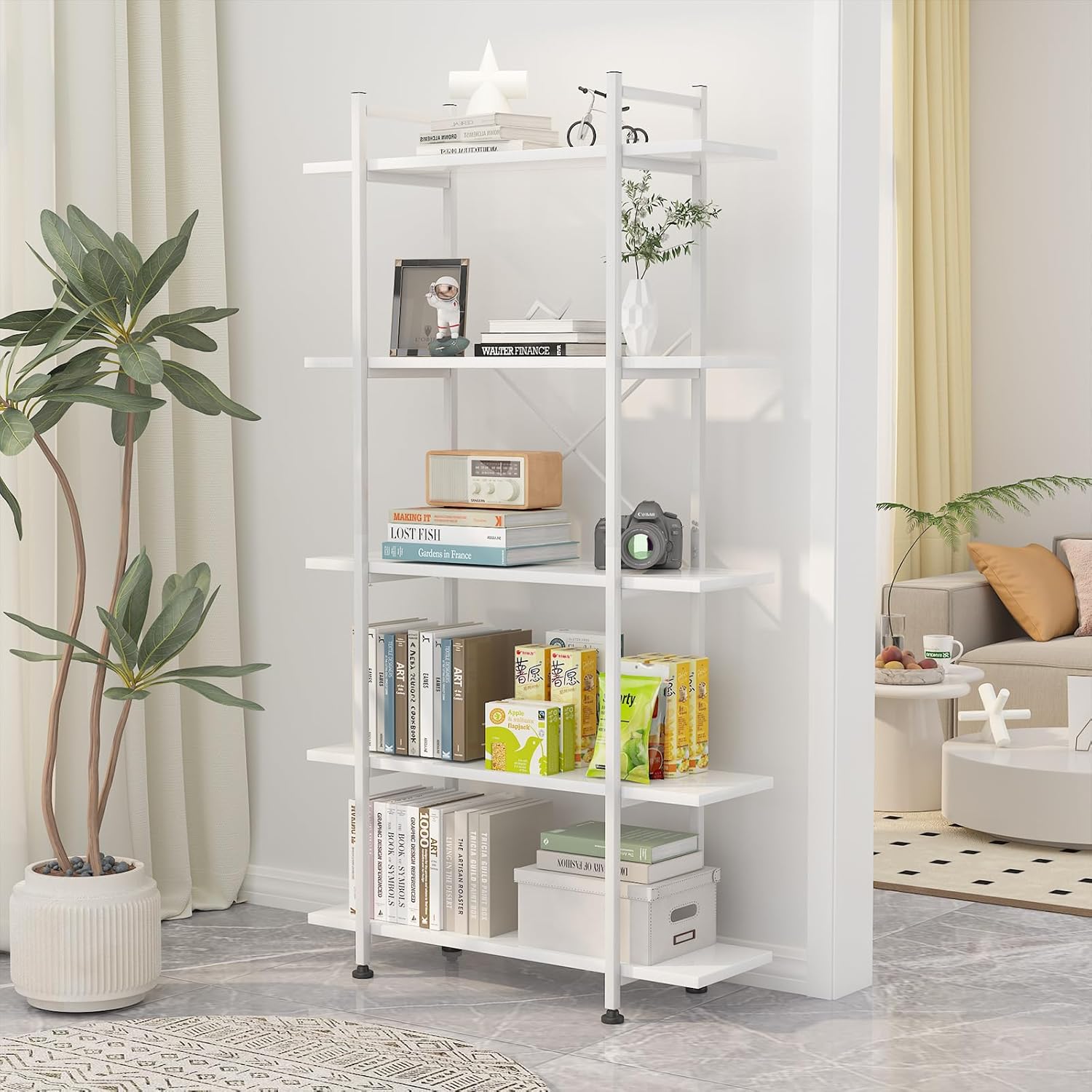 Bookshelf 5 Tiers White Wooden Storage Shelf,Modern Open Display Storage Bookcase Book Organizer,Metal Bookshelf Standing Storage Shelf Tall Shelving Units for Home Office Study