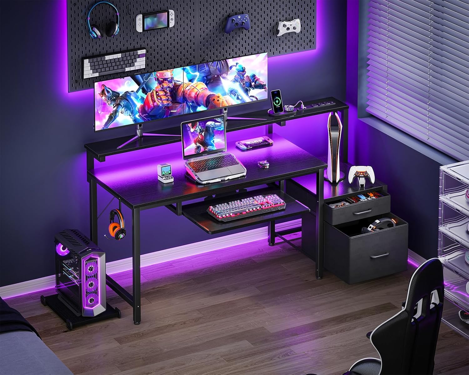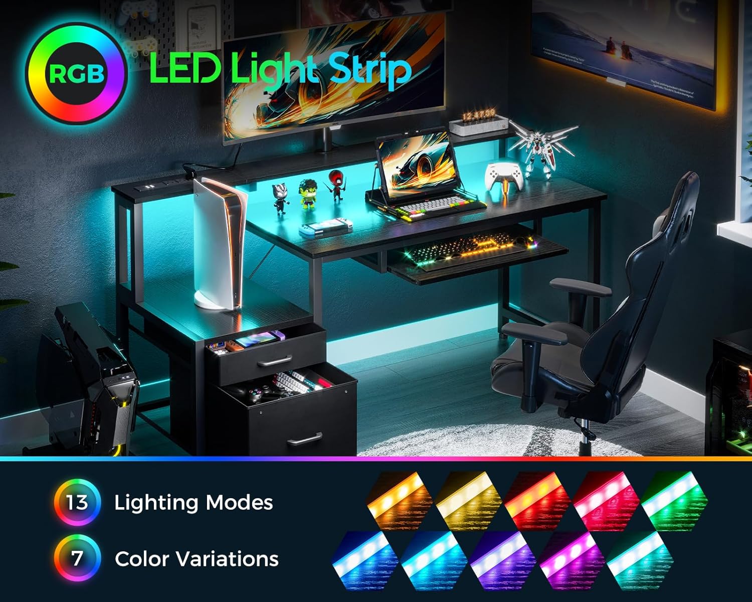 AODK Computer Desk with Drawers and Keyboard Tray, 55" Office Desk with Power Outlet and LED Lights, Reversible Study Work Desk with Printer Shelf and PC Stand for Home Office, Black